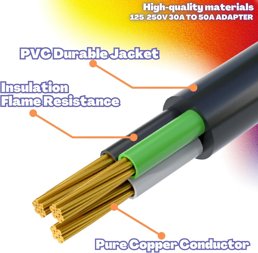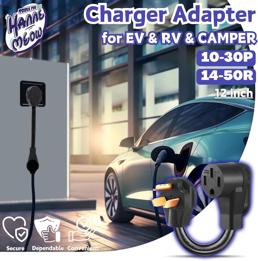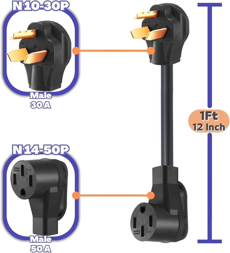 السببية: ذكر 30 أمبير NEMA 10-30P 125/250 فولت لقابس المجفف. أنثى 50 أمبير NEMA 14-50R 125/250 فولت متوافقة مع تسلا و50 أمبير RV.