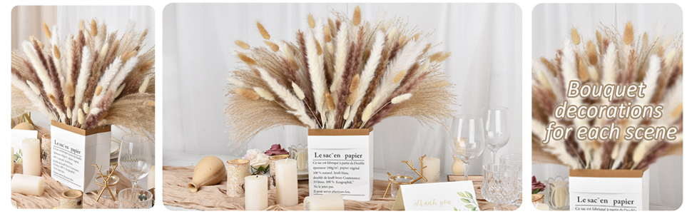 🎉【ديكور عشب بامباس】: تتميز مجموعة زهور البوهو المجففة الرائعة هذه بمظهر رقيق ويسهل العناية بها. يمكن تزيين البامبا المجففة في غرفة المعيشة والمطبخ وغرفة النوم والطاولة والغطاء وأي أماكن أخرى تريد تزيينها. إنه خيار مثالي لديكور بوهو مثل حفلات الزفاف والحفلات وبيت المزرعة.
