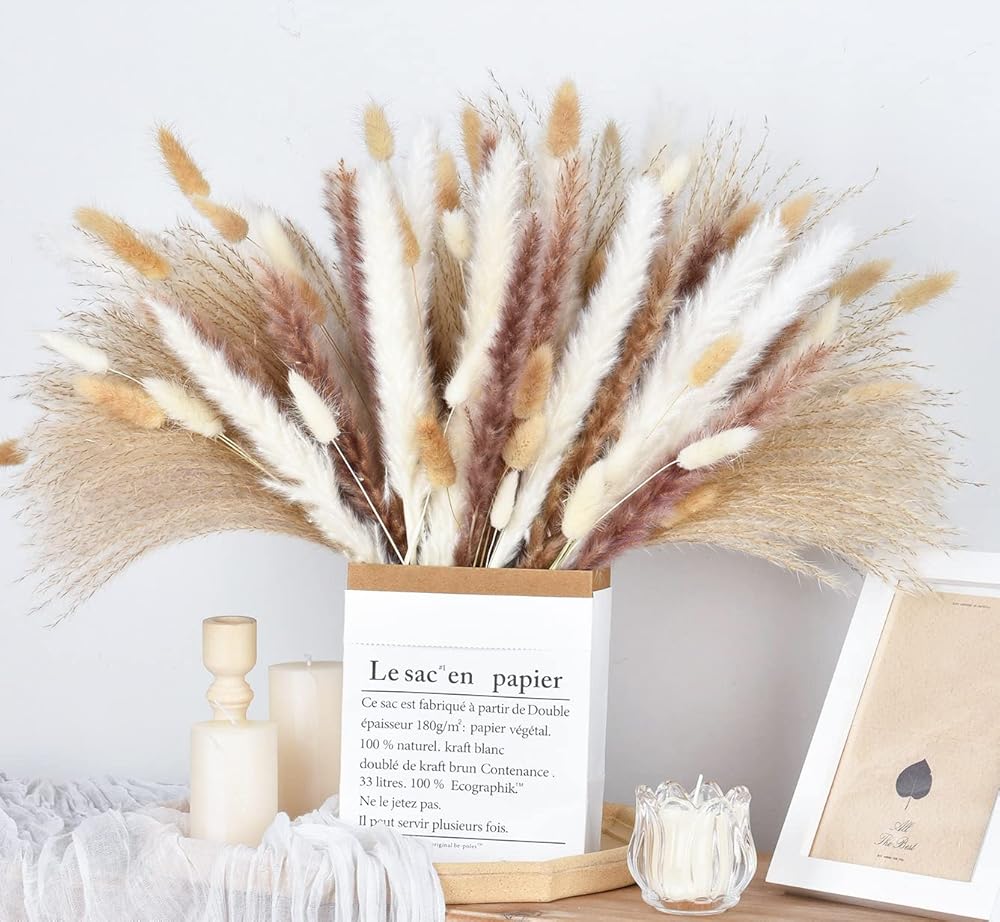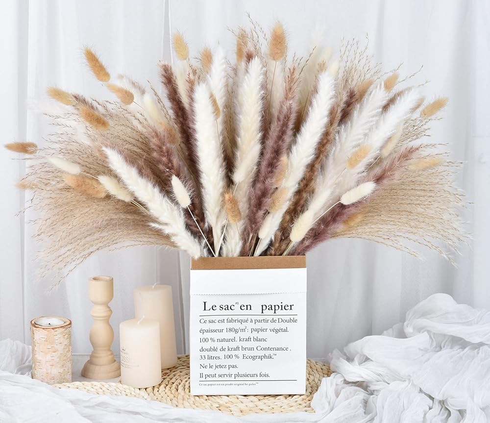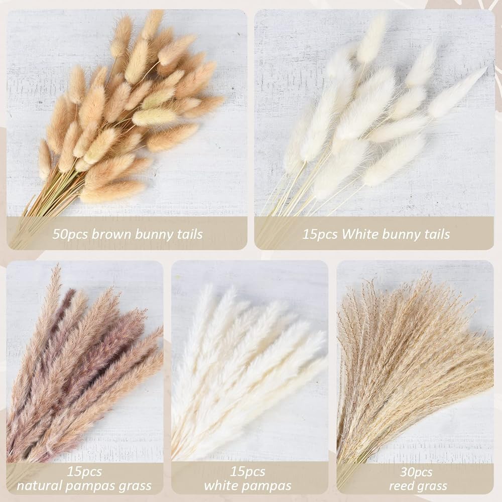 🌟【باقة عشب بامباس متعددة الأنواع】: تم اختيار ما مجموعه 125 قطعة من الزهور المجففة من 5 أنواع من عشب بامباس بعناية، يمكنك مطابقة بامباس المجففة في باقات مختلفة لتزيين الغرفة بحرية مع جو بوهيمي قوي.