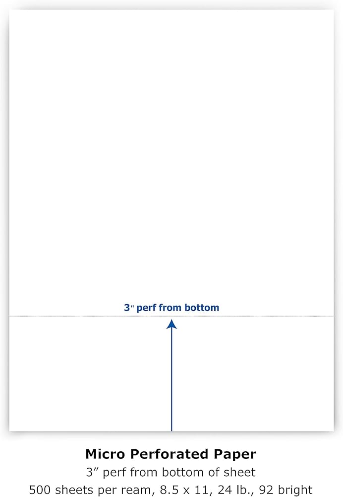 PrintWorks 04168 perf paper has a clean, horizontal microperf 3" from the bottom edge of the sheet allowing your customers to easily tear and remit payment and/or information.