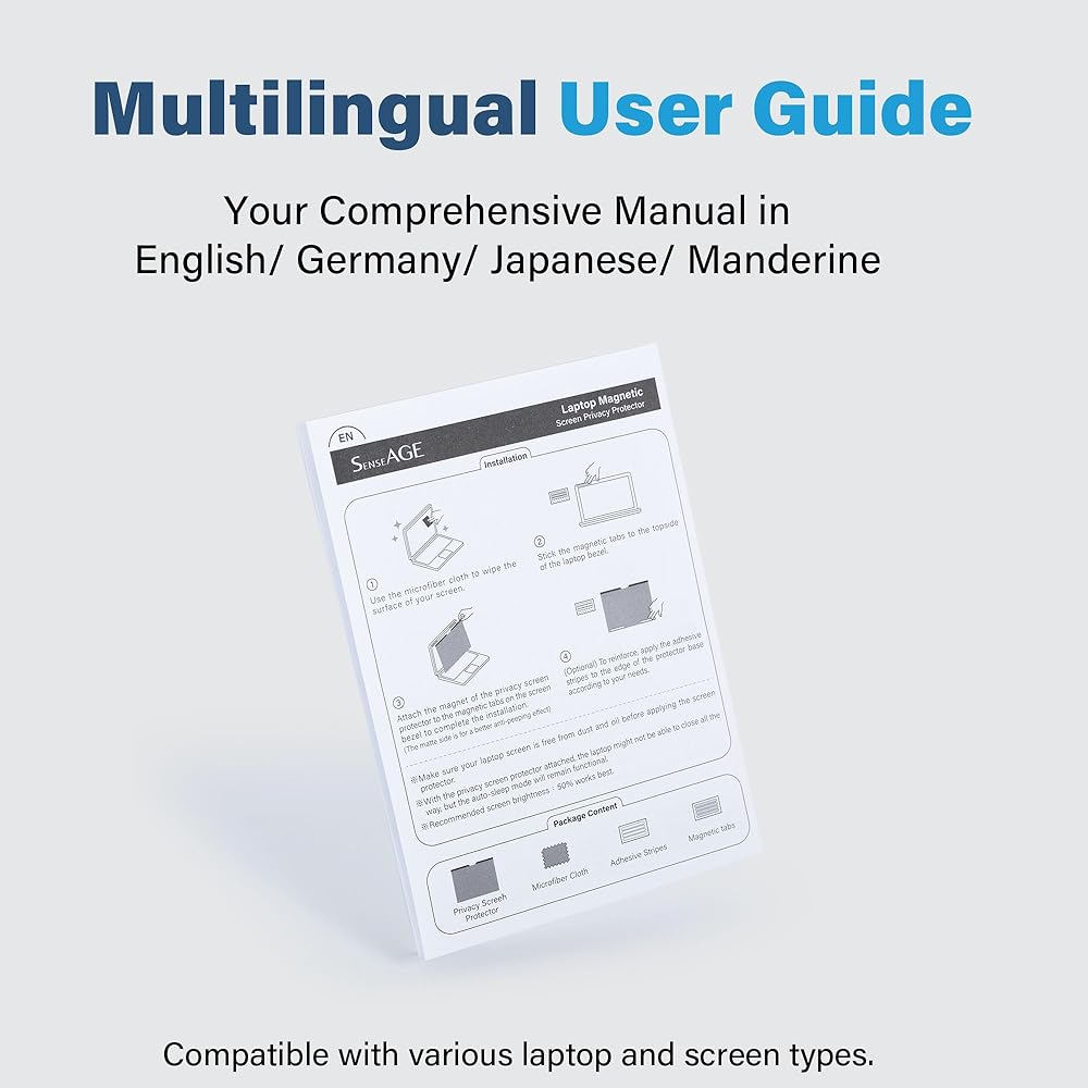 المعدات الأصلية لواقي شاشة الخصوصية SenseAGE أو مرشح الشاشة المضاد للضوء الأزرق، ولكنها تناسب الشركات المصنعة الأخرى.