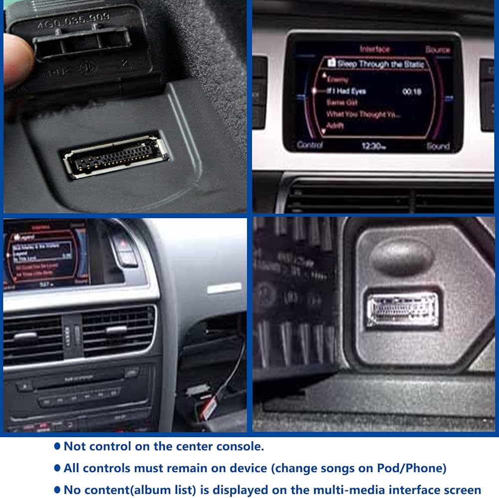 The cable transmits audio signals only, no content is displayed on the Multi-Media Interface (MMI) screen. Can not controls on the center console, it will remain on device (like as change songs on Pod/Phone)
