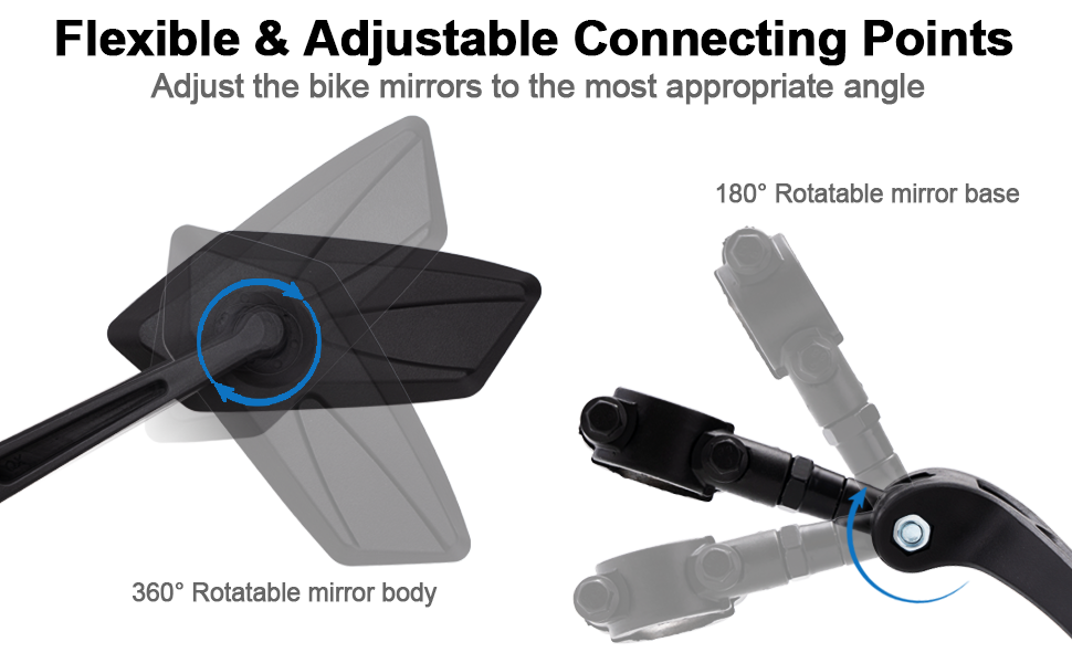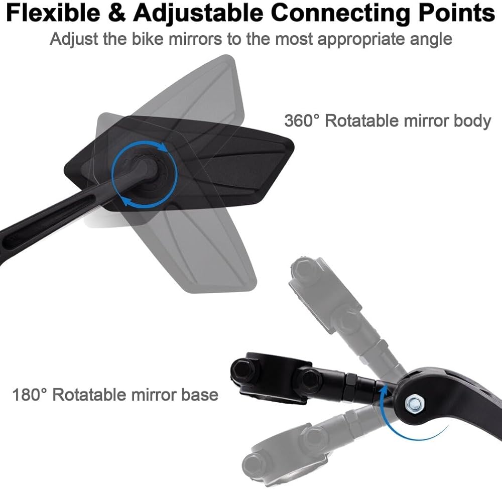 【هيكل مرن وقابل للتعديل بزاوية 360 درجة】يمكن تدوير أجزاء التوصيل لمرايا الرؤية الخلفية للدراجة بزاوية 360 درجة، مما يسمح لك بضبط المرايا على الوضع المناسب وفقًا لتفضيلاتك واحتياجاتك. تضمن مرونتها العالية سهولة التكيف مع الدراجات وبيئات ركوب الدراجات المختلفة.