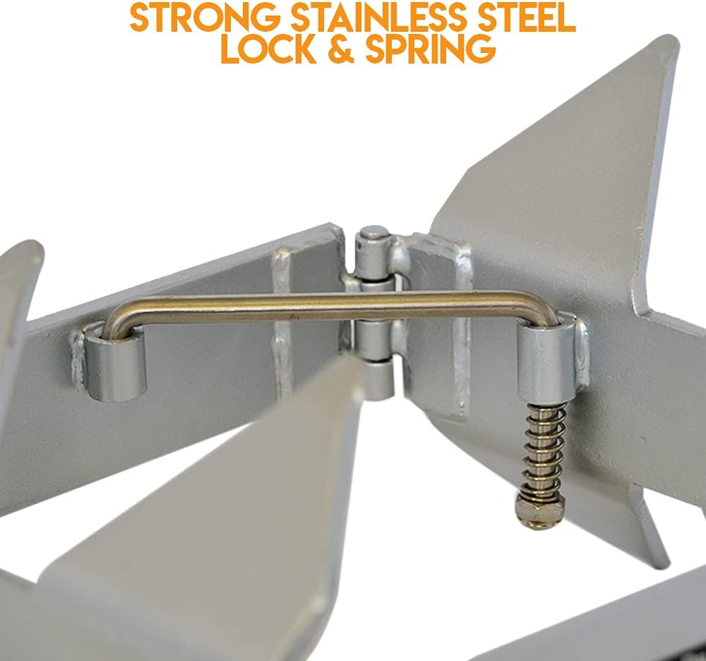 Large - Offshore/Sport to 40', Cabin Cruiser to 32' With no chain and a 2 to 1 scope, it's the best and easiest anchor you'll ever buy! The state-of-the-art anchoring system for boats of all sizes and types, in any water. Developed for the most severe water conditions - it requires NO lead chain* ... Half the anchor line of conventional anchors... SETS quickly in almost any bottom condition... retrieves easily... and folds flat for storage! Just toss it and GO... no chains required*, and no powering down! The BOX ANCHOR sets on either side it falls. In deep or shallow water, it's fixed scoop design and narrow side panels set like a "cookie cutter" into sand, mud, grass or rock. Narrow side panels elminate resistance upward for easy retrieval. Wind or current changes are no problem - resets in seconds. The stainless stell stabilizing bar and return spring make quick work of locking the anchor open for use - or collapsing the anchor for compact storage. Hot-dip galvanized with stainless stell hinge pins, stabilizing bar, return spring, and nut for years of corrosion-resistant performance, including in salt water. (*) while the Box Anchor works great offshore, it is advised that when using the Box Anchor offshore to use a length of chain on the anchor in the unprotected waters to compensate for the swell and to further reduce line chaffing.