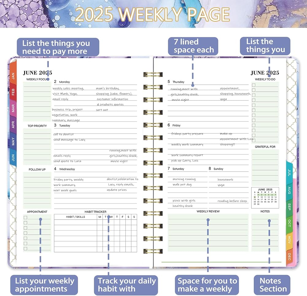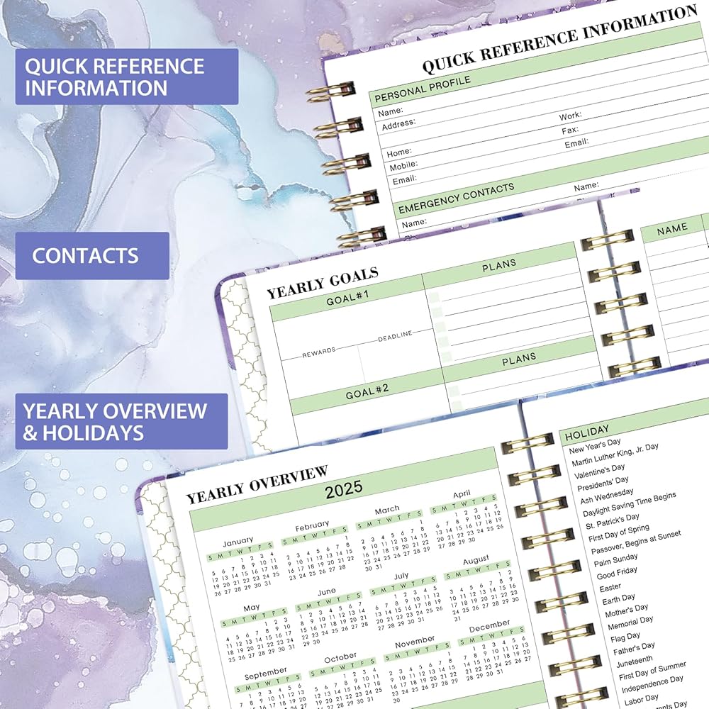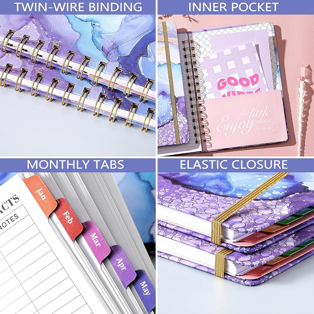 🔮 تفاصيل وظيفية للمخطط - ربط قوي بسلك مزدوج يسمح للمخطط 2024-2025 يوميًا وأسبوعيًا وشهريًا بوضع مسطح 360 درجة + 12 علامة تبويب شهرية للفحص السريع + جيب داخلي يمكنه حمل بعض البطاقات + إغلاق مرن لإبقاء المخطط مغلقًا + صفحات الاتصال + معلومات مرجعية سريعة + نظرة عامة سنوية + قوائم العطلات.