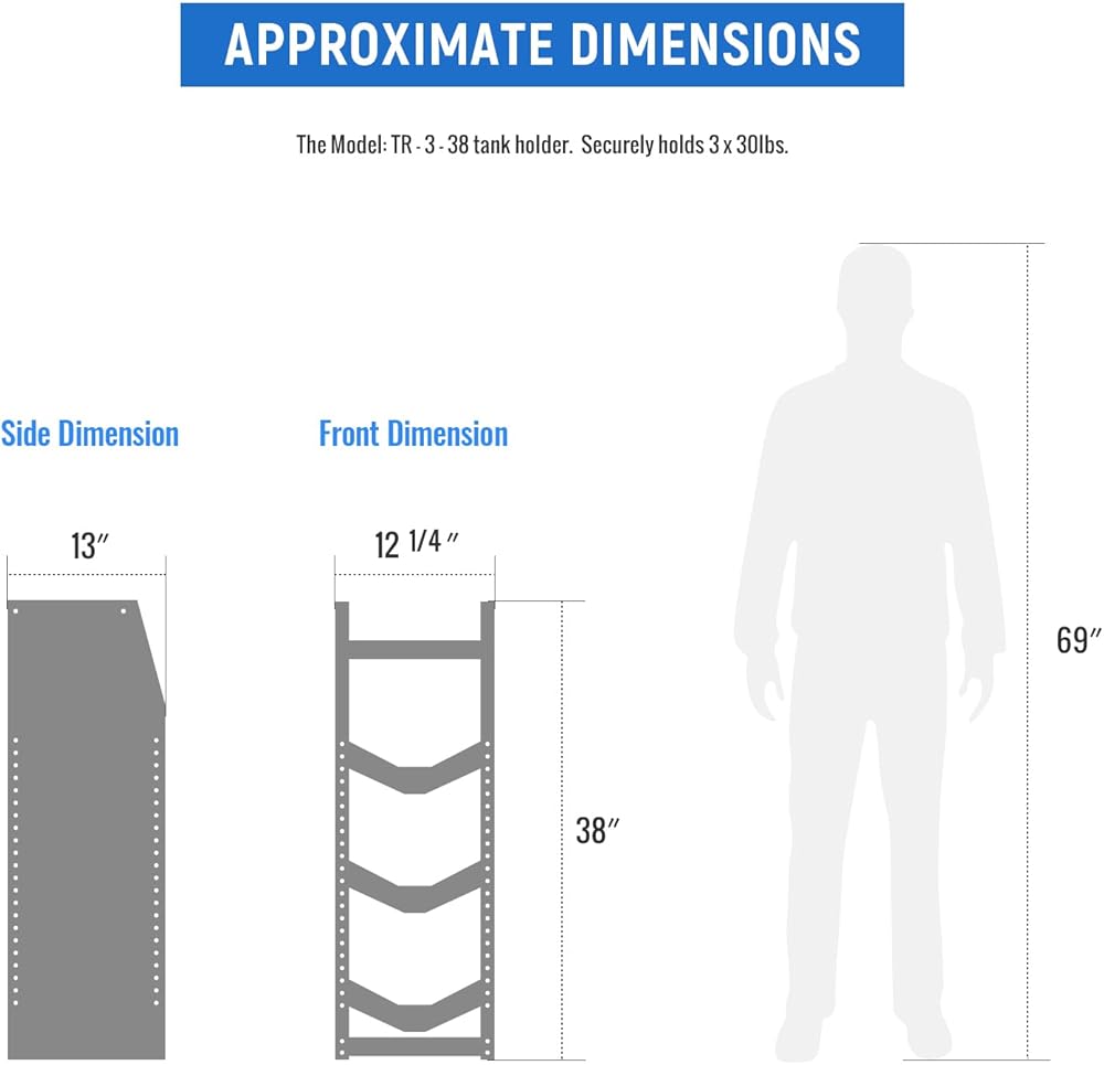 Dimensions: 38"H x 12.2"W x 13"D - Tank stand equipped with 3 x 30lbs tanks only.