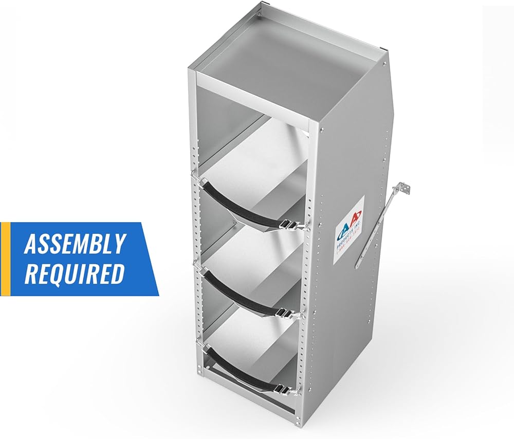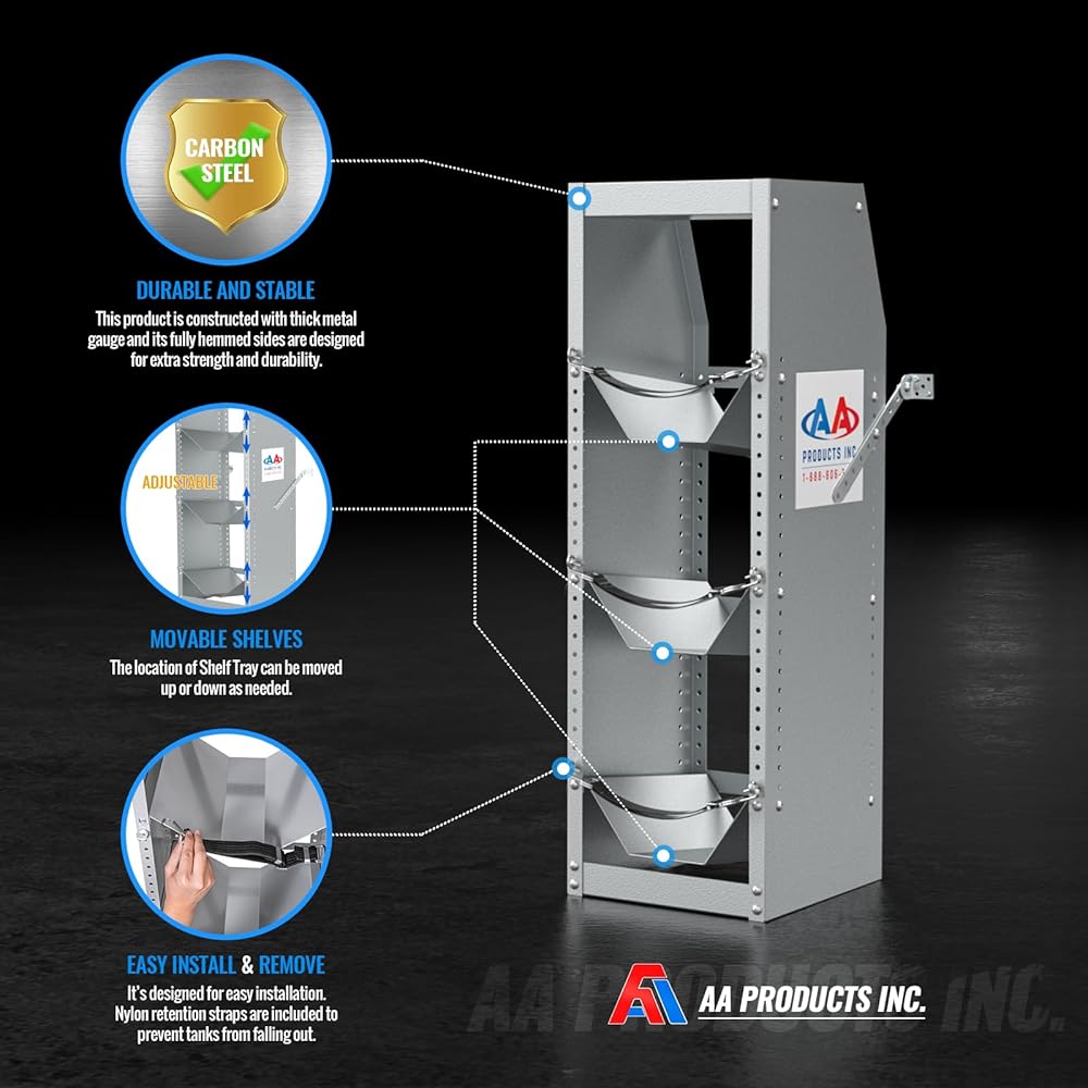 Nylon retention straps are included to prevent tanks from falling out. The location of shelf tray cab be moved up or down as needed.