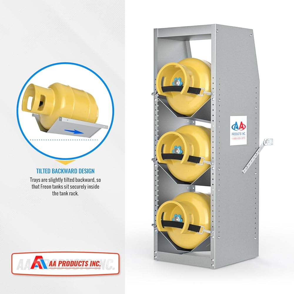 Each traies are slightly tilted backward, so that Freon tanks sit securely inside the tank rack. And it can prevent sliding efficiently.
