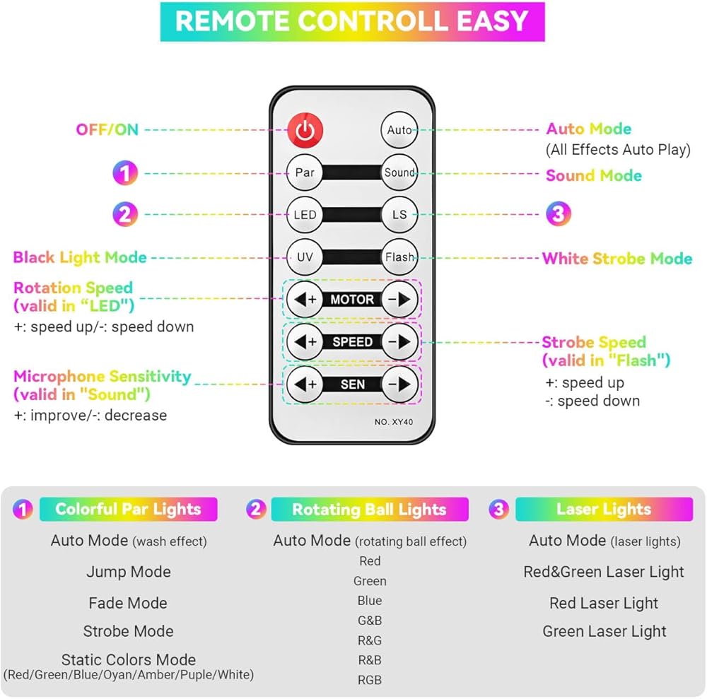 【استخدام واسع】يتميز مصباح حفلات المسرح LED بتشغيل مريح، وأوضاع متعددة مع تأثيرات إضاءة ملونة متنوعة، مثالي لإضاءة المسرح، وغرفة الديسكو، والنادي، والبار، وأعياد الميلاد، وحفلات الزفاف، وقاعات الرقص الموسيقية، ودي جي، والنوادي الليلية، والتجمع العائلي. ، فرقة الحفلة الخ