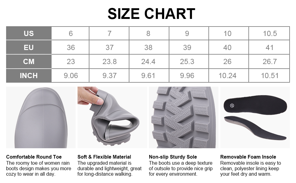 【راحة طوال اليوم】الأحذية ليست خفيفة الوزن فحسب، ولكنها تحتوي أيضًا على نعال داخلية مصبوبة قابلة للإزالة. حتى إذا كنت ترتدي أحذية المطر خفيفة الوزن والمقاومة للماء لفترة طويلة، فلن تشعر بالتعب أو التعب.