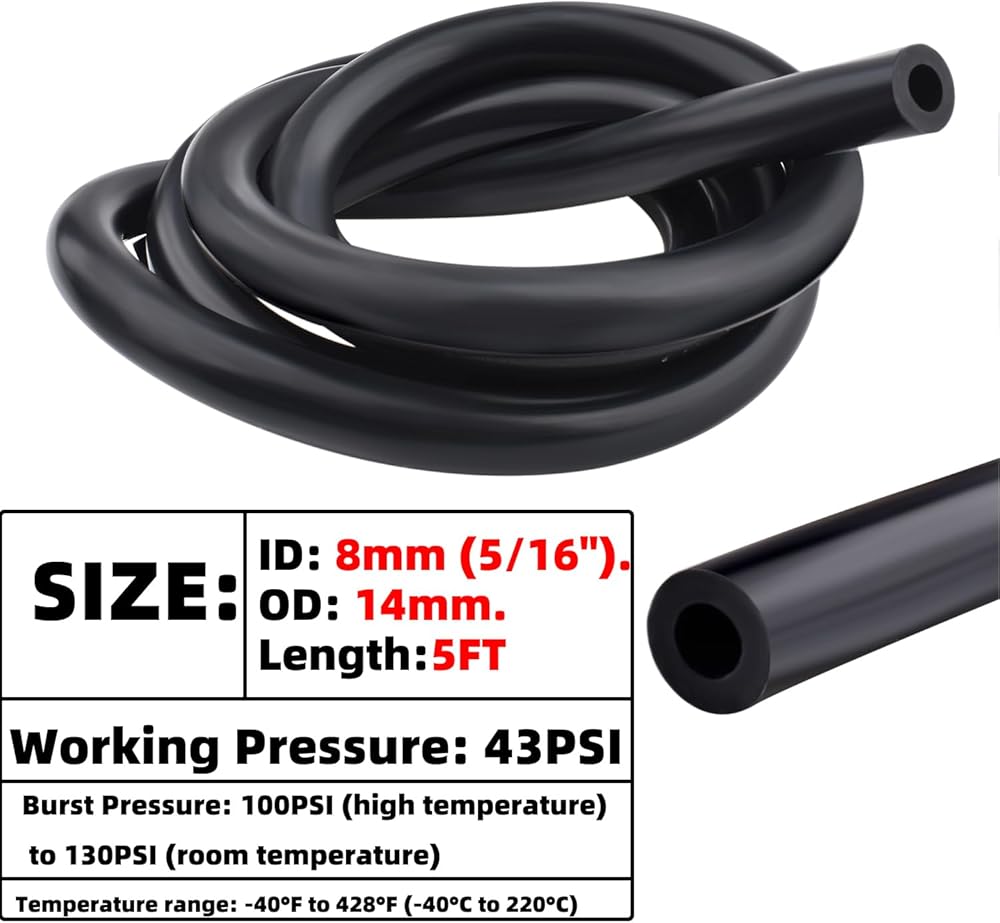 Inner Diameter: 5/16 inch (8mm). Length: 5 feet (1.5m). Wall Thickness: 1/8 inch (3mm), which can prevent collapse under vacuum.
