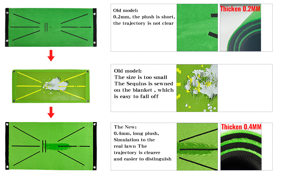 【مادة ممتازة】حصيرة لعب الجولف الخاصة بنا مصنوعة من مادة العشب المخملية ذات التأثير. سُمك 4 مم مطاط SBR متين عالي الجودة، في الجزء السفلي، سطح ضرب العشب الحقيقي يحاكي الممر الحقيقي أو صندوق الإنطلاق مما يسمح بشعور حقيقي بالضرب والقيادة والتقطيع ووضع التدريبات.