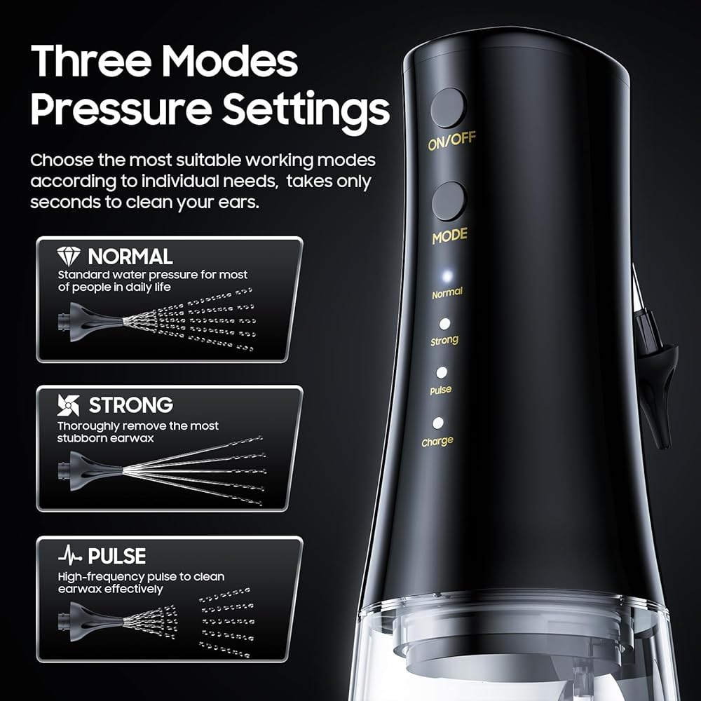 • 【إعدادات الضغط بثلاثة أوضاع】يحتوي نظام تنظيف الأذن على ثلاثة أوضاع للتنظيف (عادي، قوي، نبضي) مع 5 تيارات من الماء لإزالة شمع الأذن والحفاظ على طبلة الأذن آمنة. يمكنك اختيار وضع العمل الأكثر ملاءمة وفقًا للاحتياجات الفردية، ويستغرق تنظيف أذنيك ثوانٍ فقط.