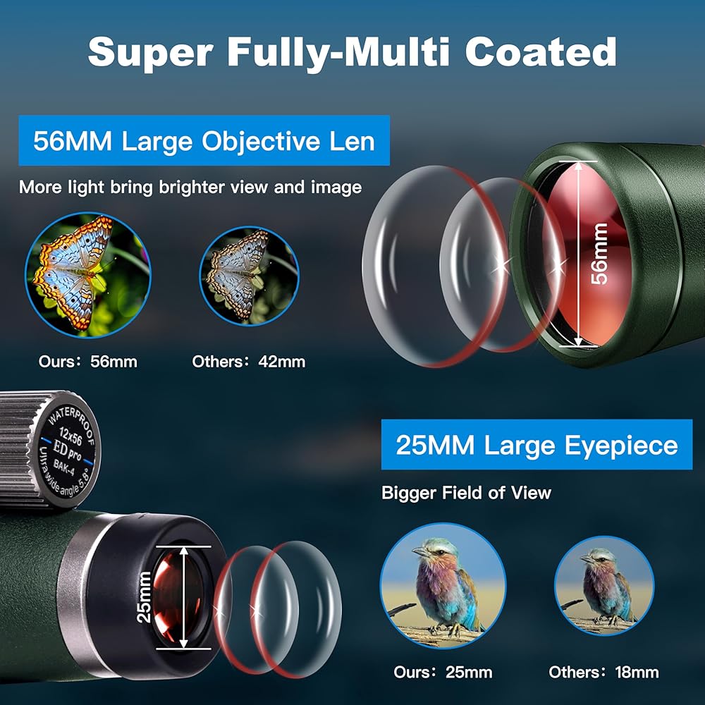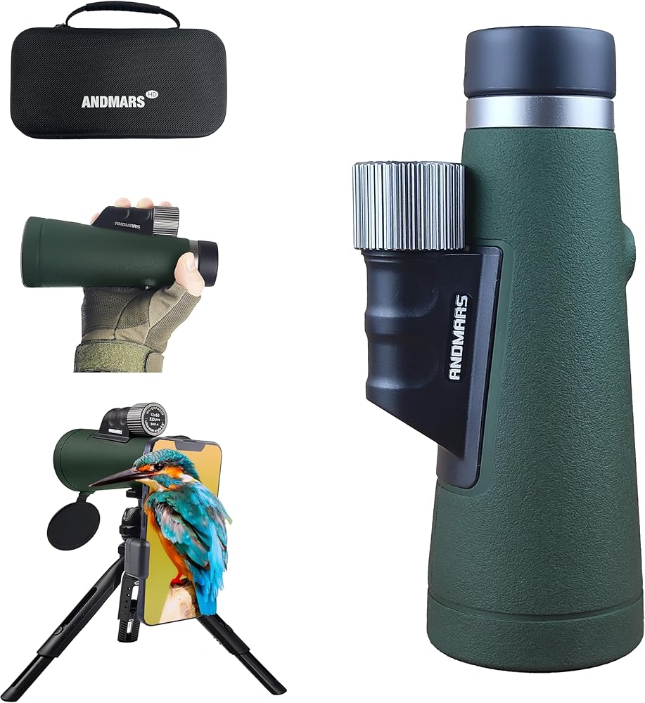 2024 منظار Andmars 12x56 ED الجديد عالي القوة للبالغين. تلسكوب مقاوم للماء مع صندوق ومحول هاتف وحامل ثلاثي القوائم. FMC المغلفة ومنشور BAK4. لصيد الطيور والمشي لمسافات طويلة. (أخضر)