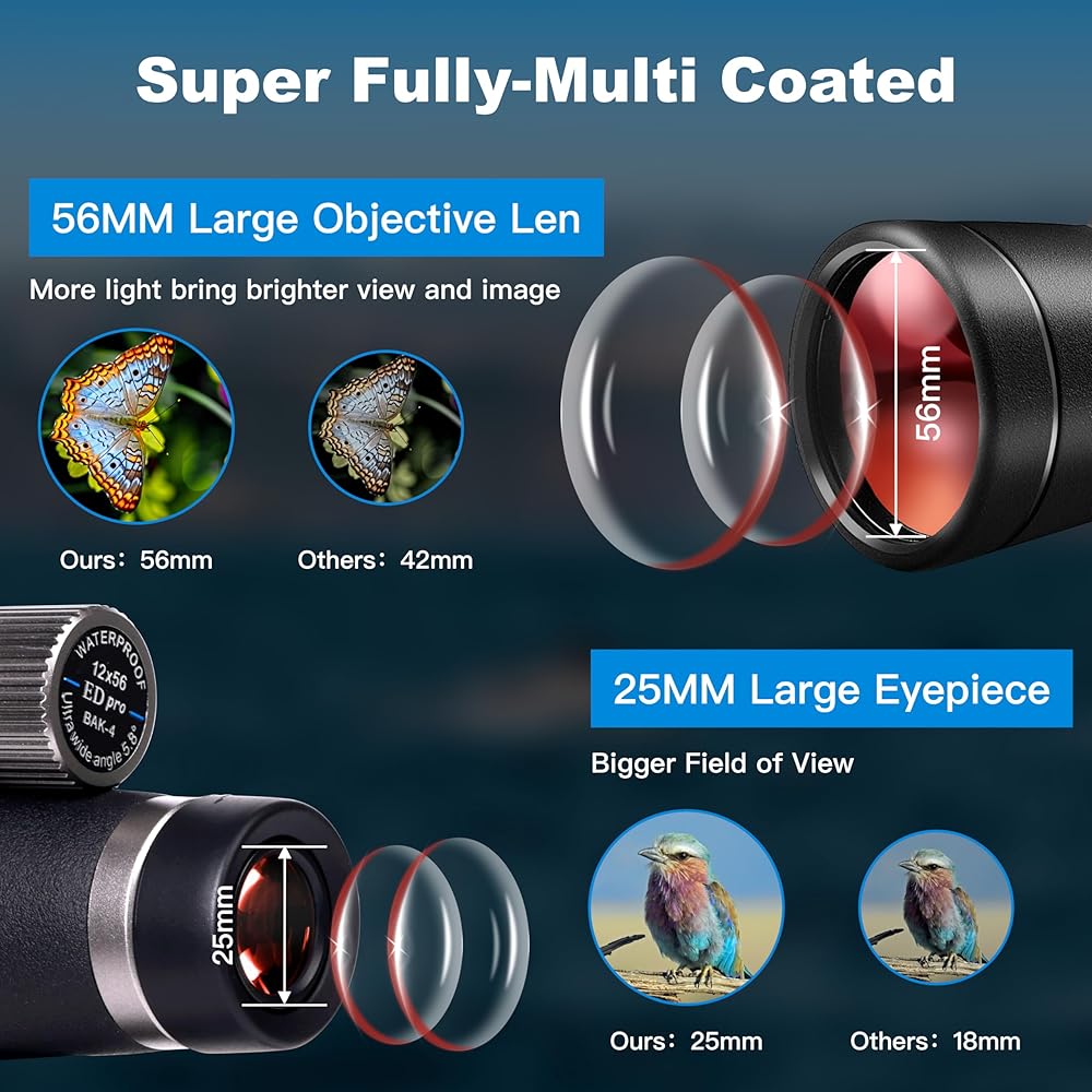 【منشور كبير BAK-4 وطلاء عدسة FMC ممتاز】يتميز منظارنا الأحادي مقاس 12 × 56 بتقنية متقدمة متعددة الطلاء بالكامل وعدسة منشورية BAK4 كبيرة، لزيادة كمية نقل الضوء وتقليل انعكاس الضوء غير الضروري، وتوفير لون واضح وعالي التباين. -صور دقيقة في نفس الوقت. سواء كنت ترتدي نظارات أم لا، يمكن لهذا المنظار أن يوفر منظرًا جميلاً أثناء مغامراتك الخارجية ولن تشعر بالدوار حتى بعد المشاهدة لفترة طويلة.