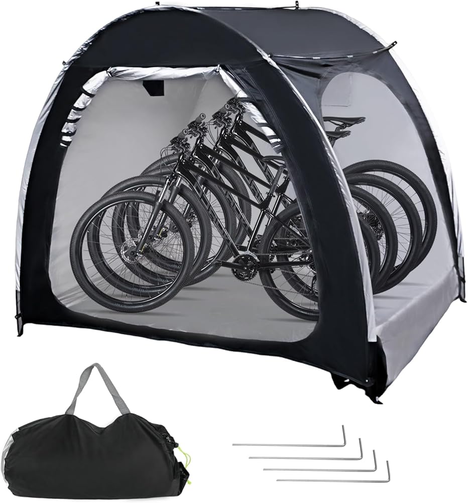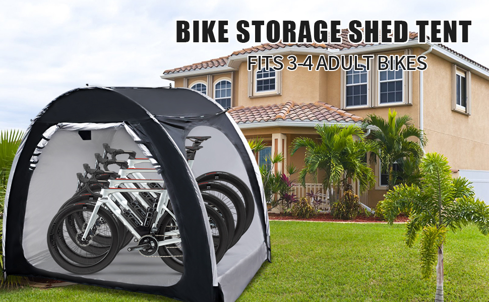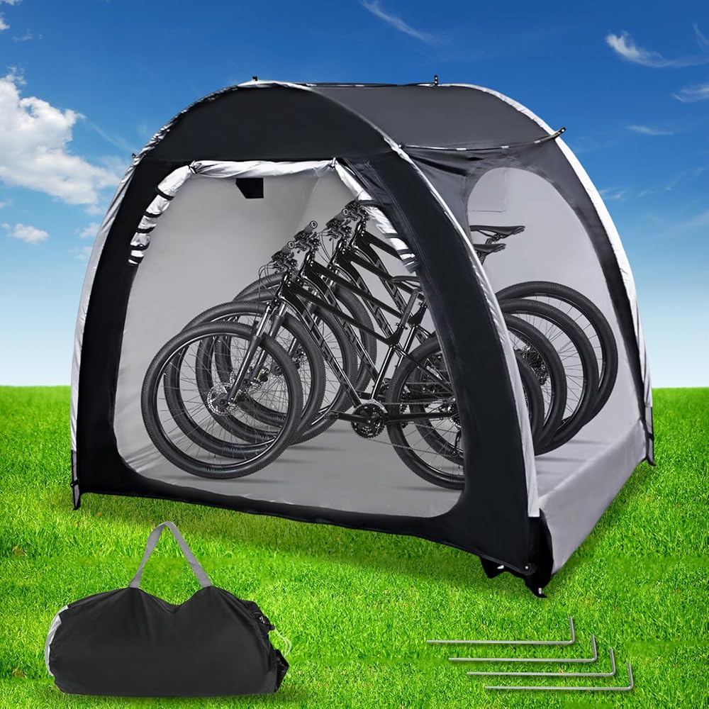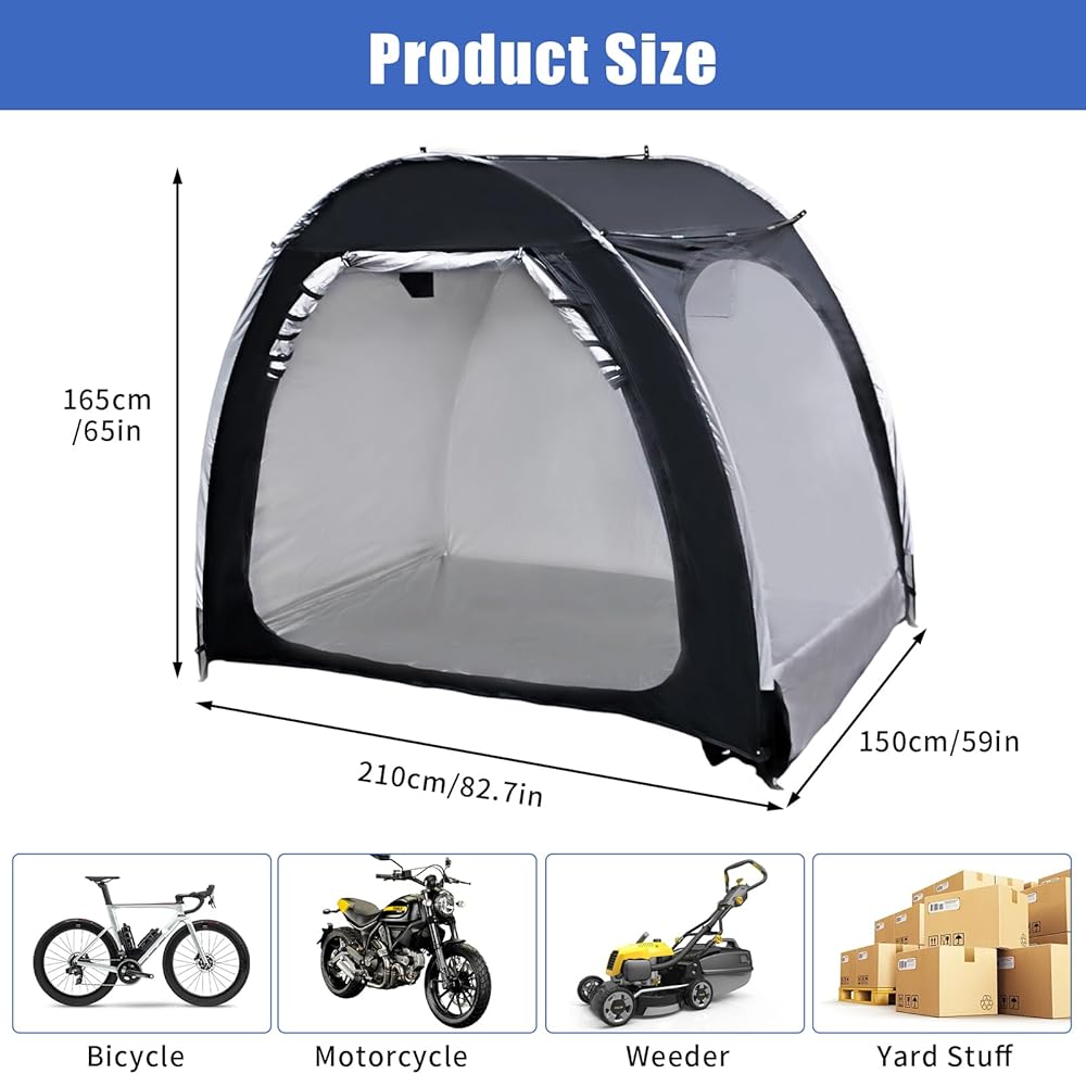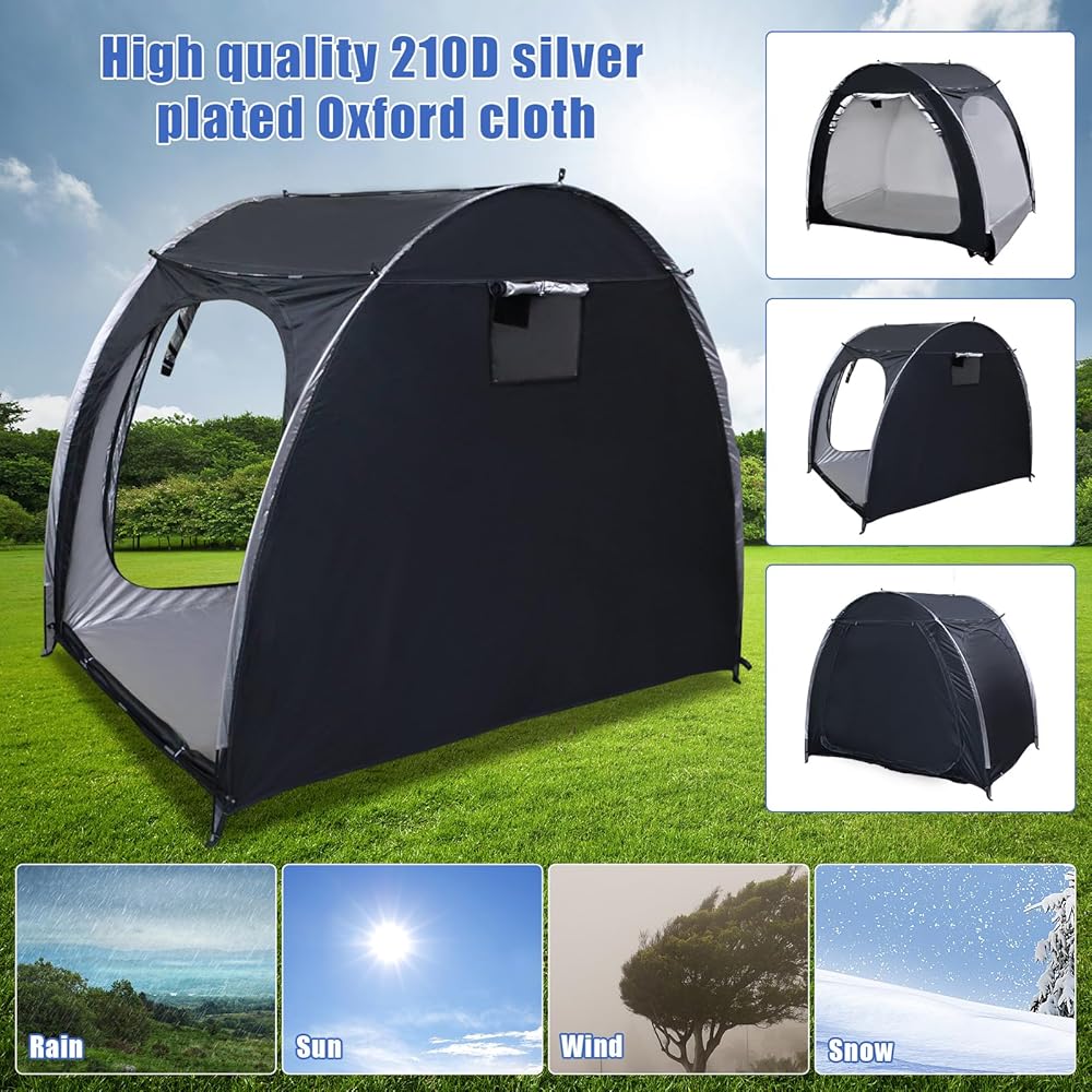 أغطية الدراجة خيمة سقيفة للتخزين لـ 4 دراجات، سقيفة تخزين للدراجات النارية بأبواب مزدوجة في الهواء الطلق، قماش أكسفورد 210D مقاوم للماء PU4000 مع حقيبة سفر 82.7 × 59 × 65 بوصة (أسود)