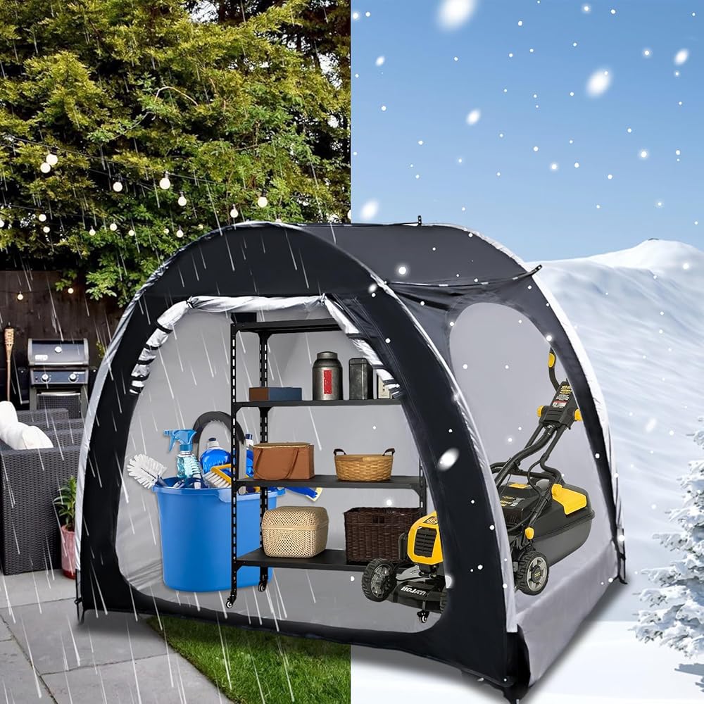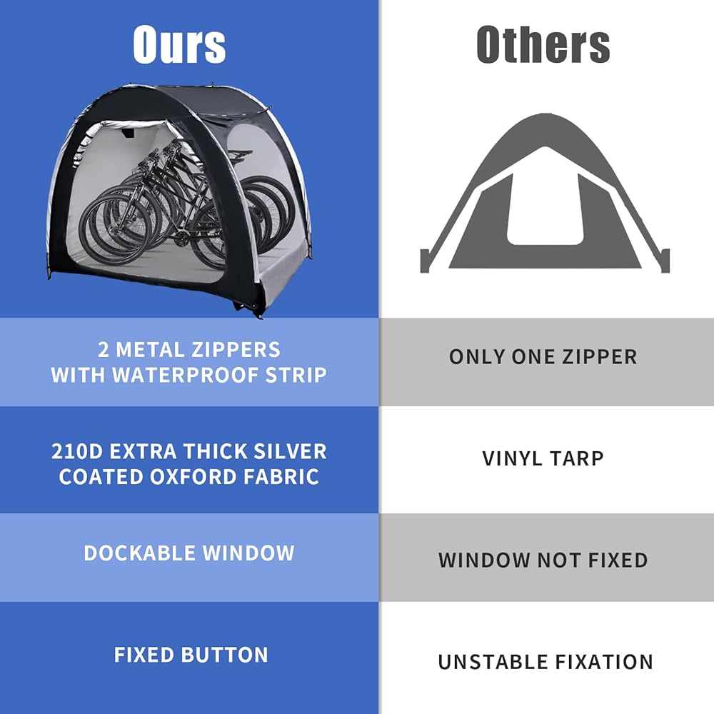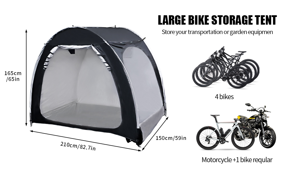 • مساحة تخزين أكبر: 82.7 × 59 × 65 بوصة، مساحة كبيرة يمكنها استيعاب 4 دراجات أو 2-3 دراجات إلكترونية بإطارات سميكة. باعتبارها خيمة تخزين خارجية، يمكنها أيضًا تخزين أدوات الحديقة ذات المقبض الطويل وسجاد الأثاث والدراجات وجزازات العشب والمبردات وألعاب حمام السباحة وغيرها من الأشياء. يمكنك أيضًا استخدامه كمخيم أو أي غرض آخر تريده.