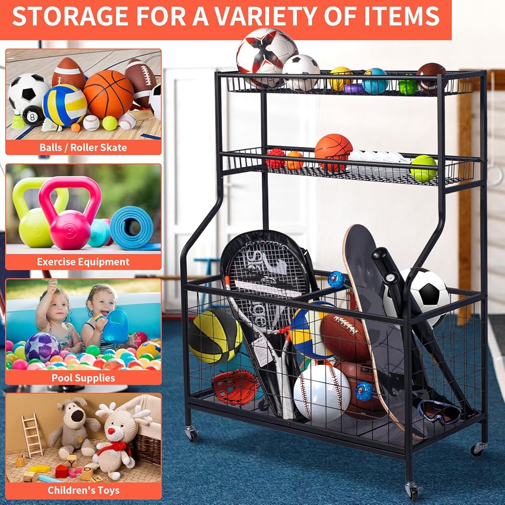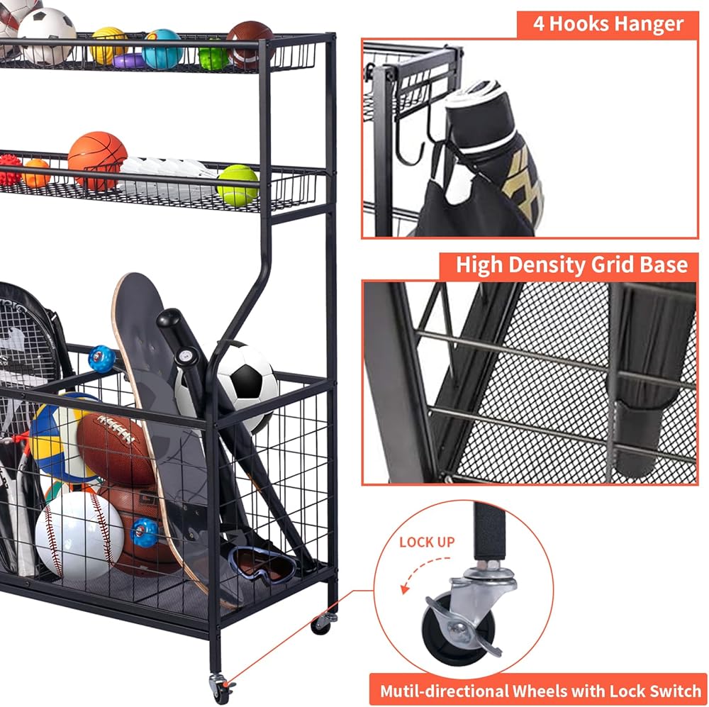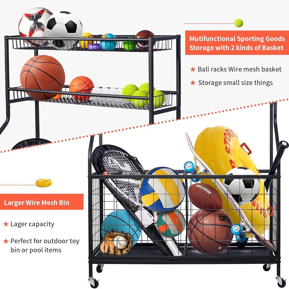 🏀】: عربة تخزين المعدات الرياضية هذه مصنوعة من مواد عالية الجودة فولاذ مطلي بمسحوق أسود عالي الجودة، مقاوم للصدأ ومتين. يعد منظم الأدوات الرياضية هذا عمليًا حقًا للحفاظ على مظهر منزلك أنيقًا وفعالاً.