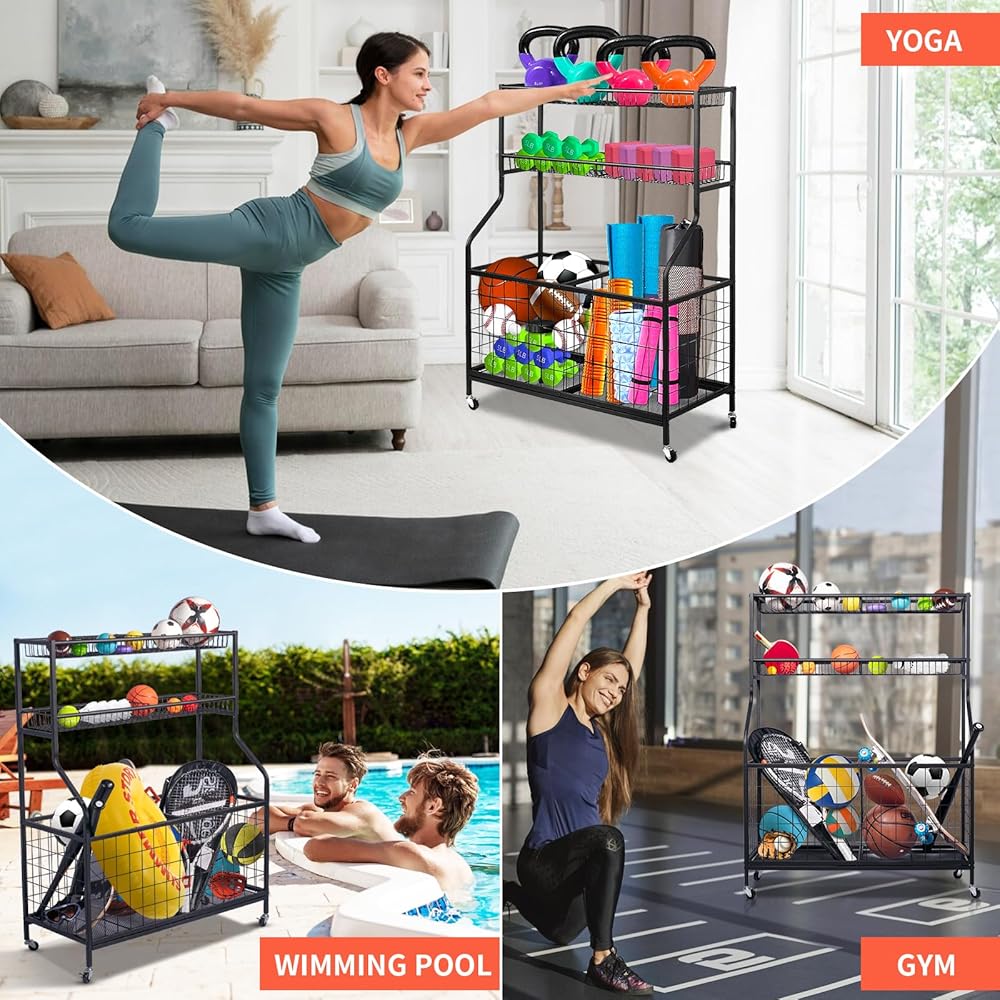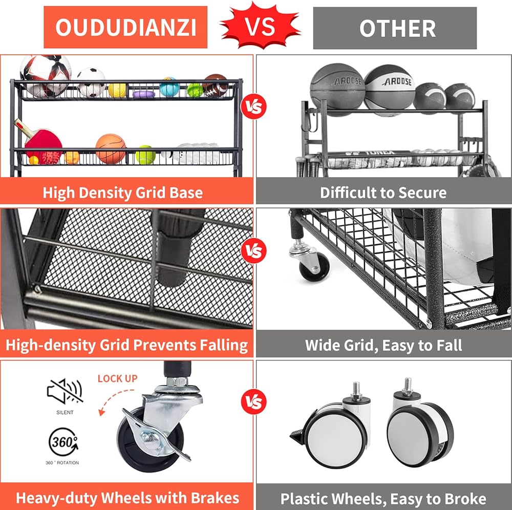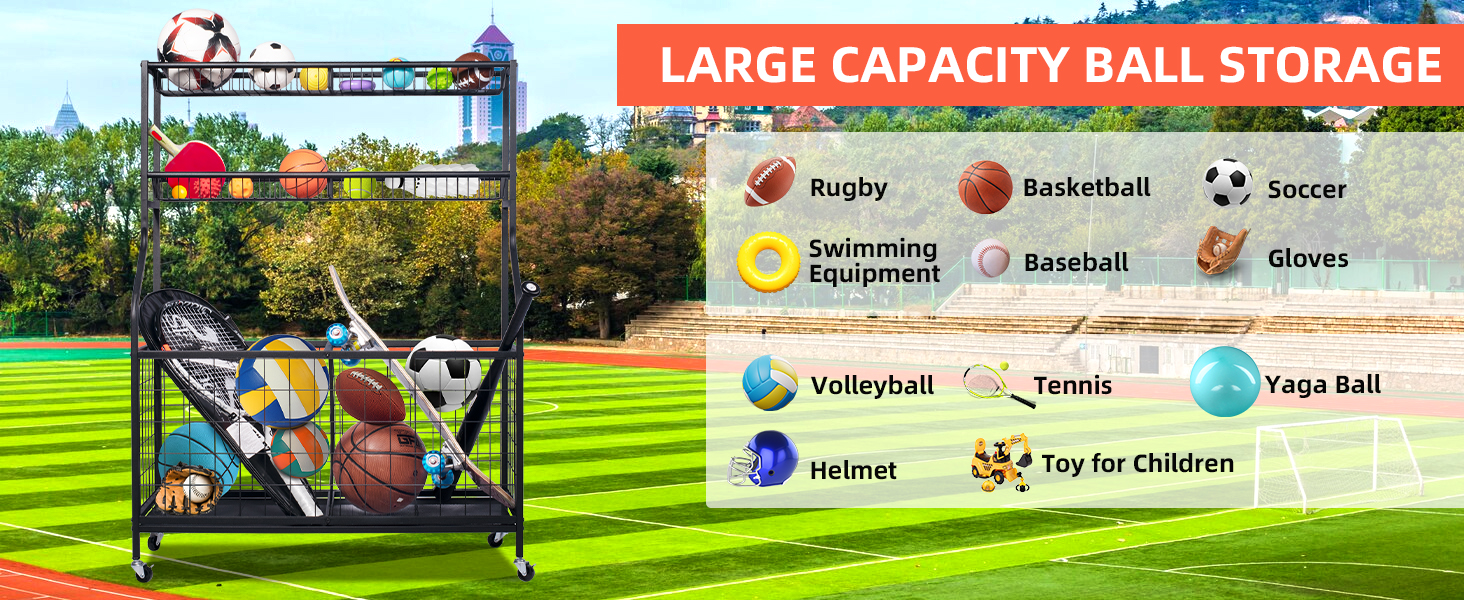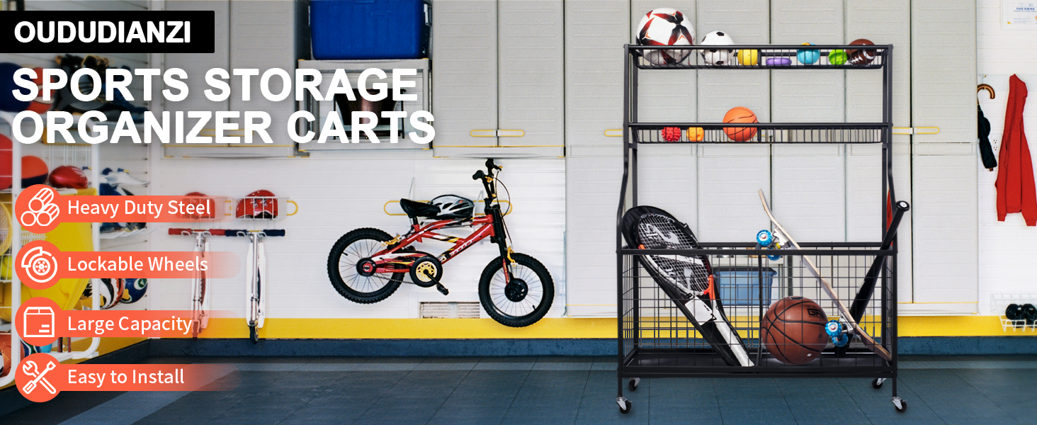 🏀】: عربة تخزين المعدات الرياضية هذه مصنوعة من مواد عالية الجودة فولاذ مطلي بمسحوق أسود عالي الجودة، مقاوم للصدأ ومتين. يعد منظم الأدوات الرياضية هذا عمليًا حقًا للحفاظ على مظهر منزلك أنيقًا وفعالاً.