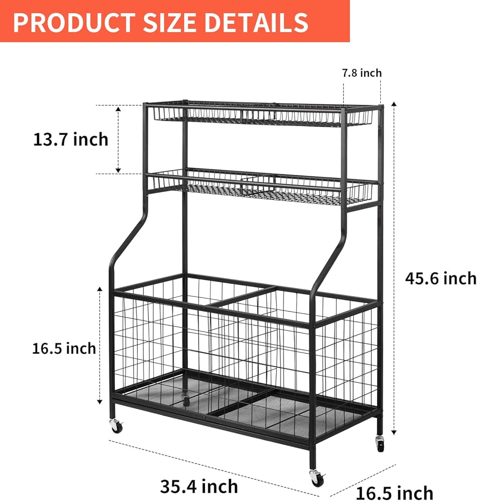 🏀【𝗟𝗔𝗥𝗚𝗘 𝗖𝗔𝗣𝗔𝗖𝗜𝗧𝗬 𝗚𝗔𝗥𝗔𝗚𝗘 𝗢𝗥𝗚𝗔𝗡𝗜𝗭𝗘𝗥】: هذا يتميز مرآب تخزين الكرة بصندوقين لتخزين كرة السلة وسلتين شبكيتين معدنيتين طويلتين، والتي يمكنها تخزين أنواع من المعدات الرياضية، مثل كرات السلة وكرات القدم والخفافيش والهوكي الميداني، وحتى يمكن استخدامها كمرآب تخزين الألعاب؛ قم بتخزين معداتك الرياضية في مرآب حامل الكرات هذا لتوفير المساحة حقًا.
