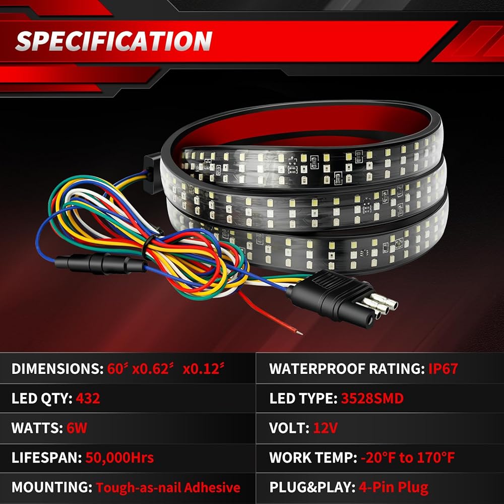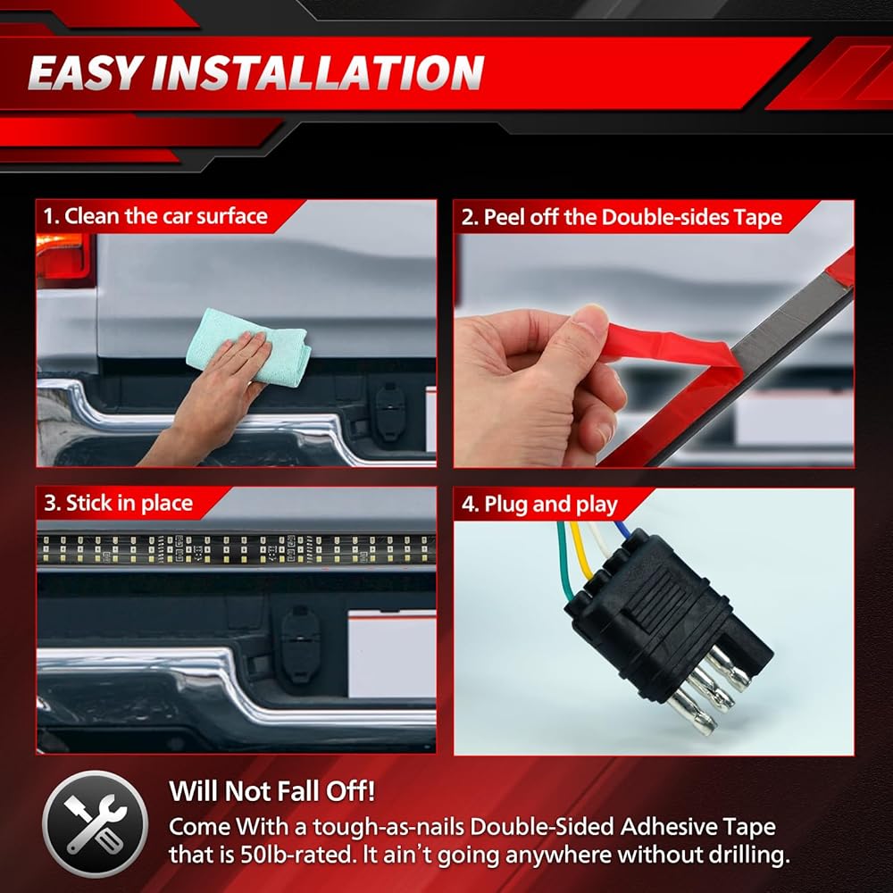 تركيب سهل - قم بإزالة الشريط اللاصق ببساطة، والصقه على الباب الخلفي، وقم بتوصيل القابس/السلك. يرجى ملاحظة أن بعض الشاحنات قد تحتاج إلى تعديلات. للحصول على أفضل جودة للتطبيق، لا تقم بثني الشريط أو طيه