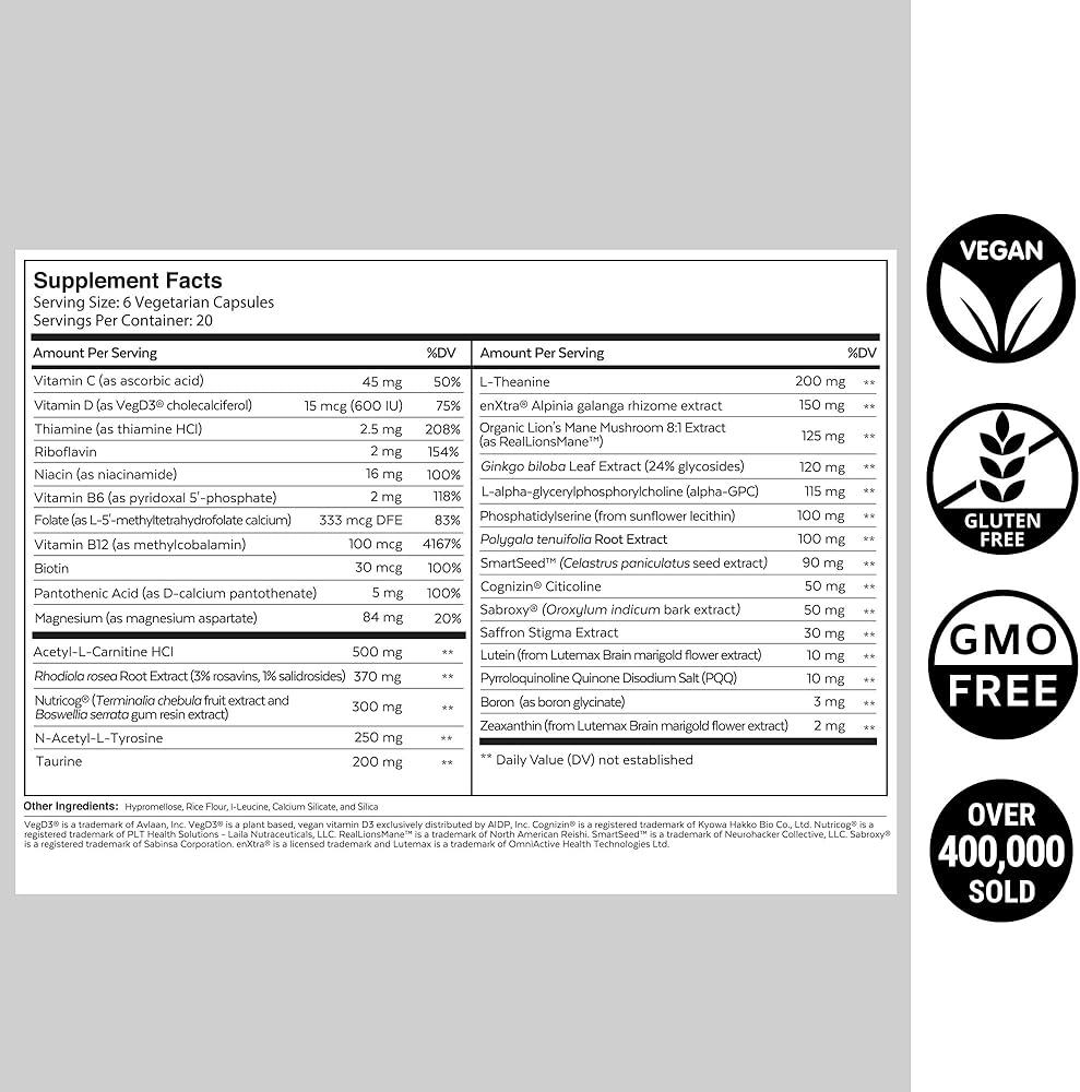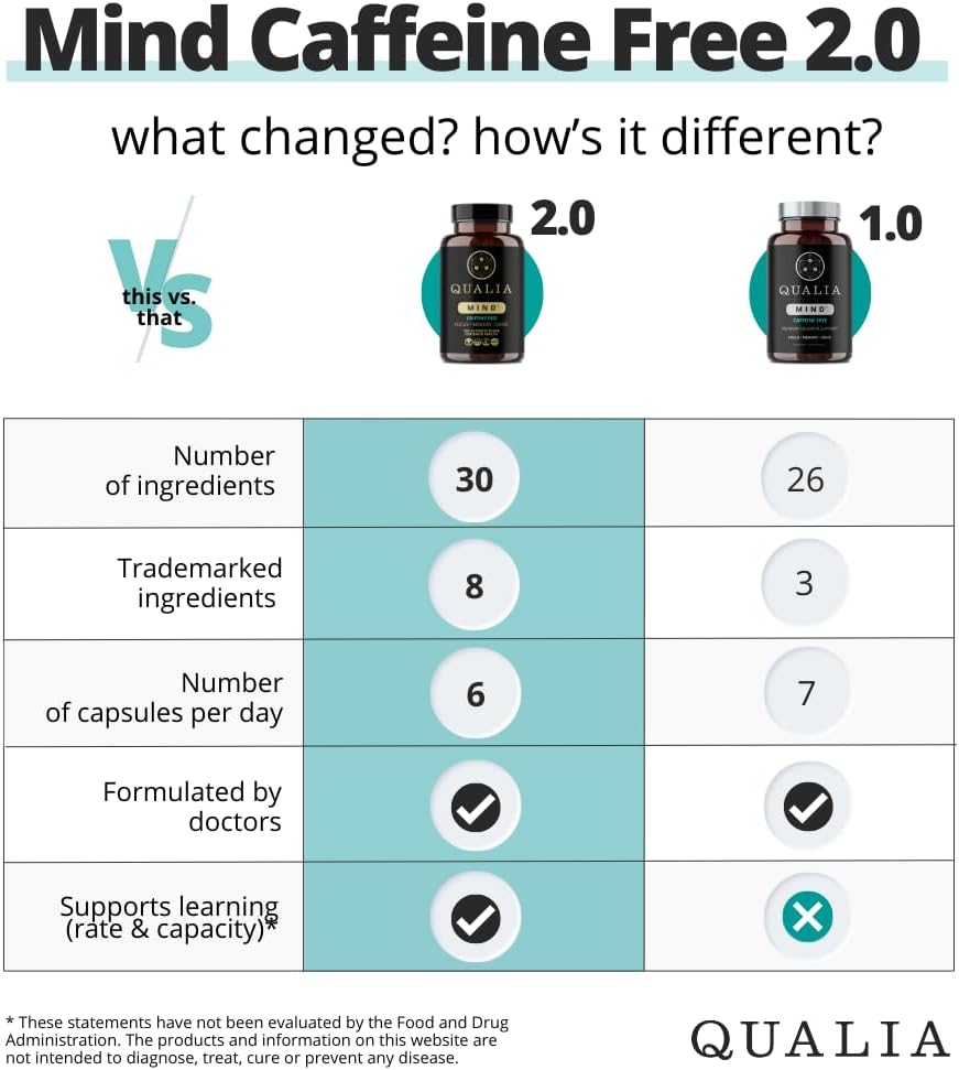 تعزيز صحة الدماغ - بالإضافة إلى التأثيرات الكيميائية العصبية والفسيولوجية الفورية، يخطو Qualia Mind Caffeine Free خطوة أخرى في معالجة فوائد الصحة الإدراكية طويلة المدى. دعم زيادة نمو الخلايا العصبية والمشبك العصبي، وATP الميتوكوندريا، وهياكل الخلايا الأكثر صحة، والتعقيد العصبي.