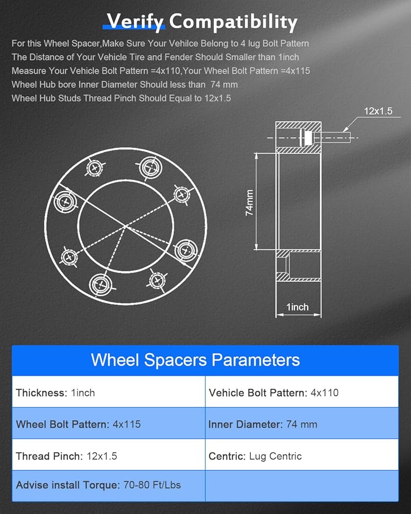 🚘【تركيب أساسي للتحقق】 حتى إذا كانت السيارة مدرجة على أنها متوافقة، فلا يزال المشترون بحاجة إلى التحقق من: 1) مسامير العجلة عبارة عن خيوط مقاس 12 × 1.5 مم؛ 2) لديك أكثر من بوصة واحدة من المساحة بين الحاجز والعجلة/الإطار الخاص بك؛ 3) تكون مسامير عجلة المصنع الخاصة بك أقصر من 1 بوصة (ملاحظة: إذا كانت مسامير العجلة طويلة جدًا، فقد تحتاج إلى طحن/تقليم المسامير لأسفل لتناسبها)؛ 4) يجب ألا يقل تجويف مركز العجلة عن 74 مم