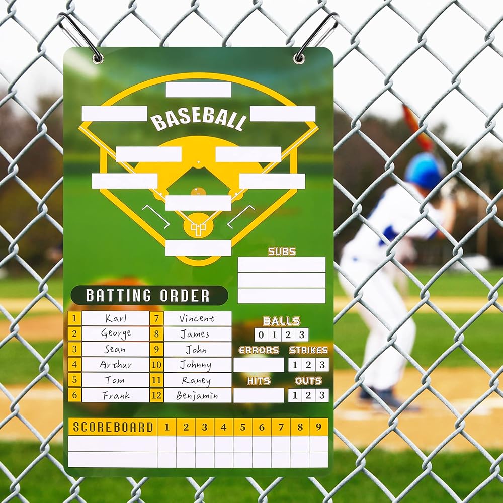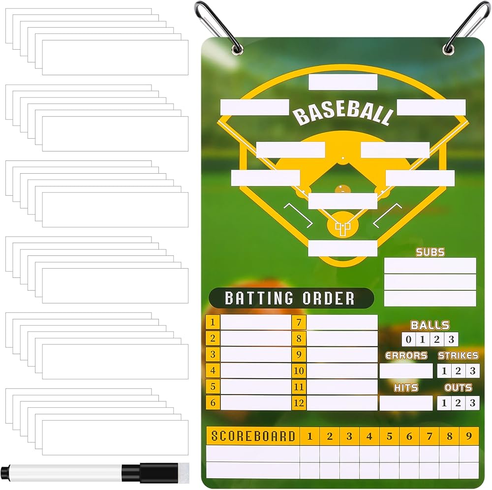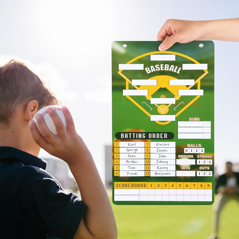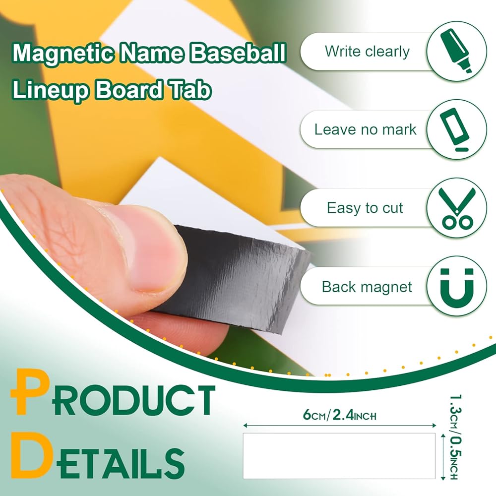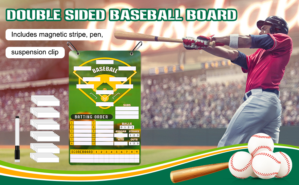 ملحوظة: لوحة البيسبول التدريبية نفسها لا تحتوي على مغناطيس. ومع ذلك، يمكن أن تلتصق بطاقات التشكيلة المغناطيسية بلوحة التدريب هذه. تتميز طبقة لوحة تشكيلة البيسبول بسطح أملس يسهل الكتابة عليه ومسحه.