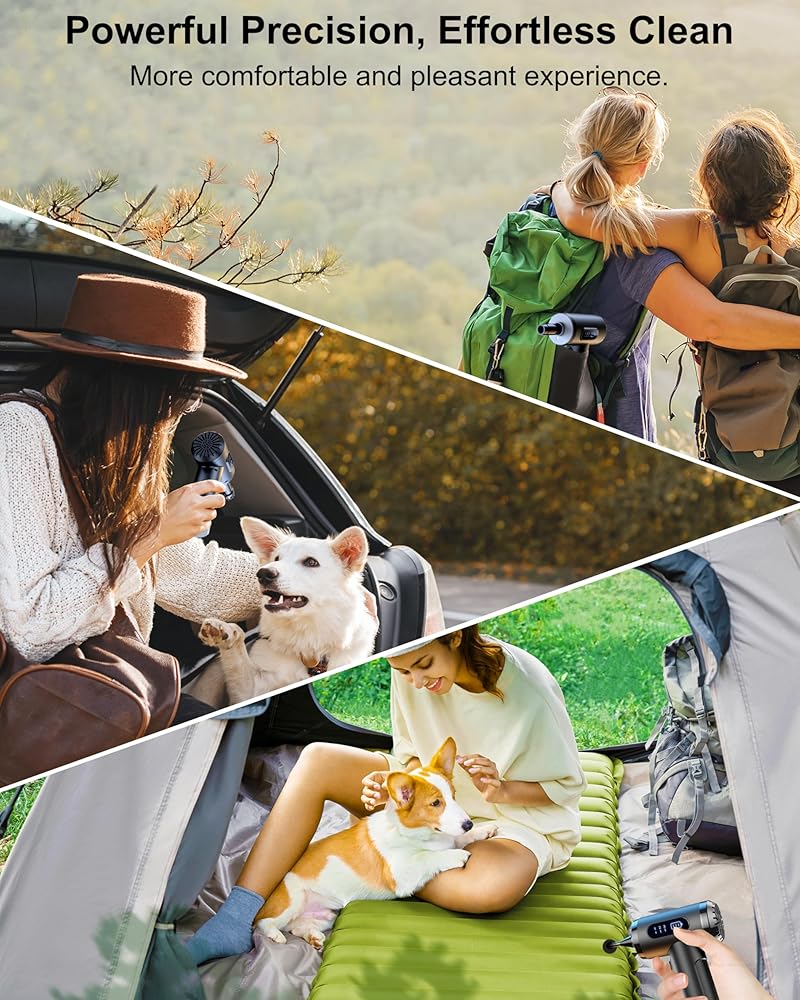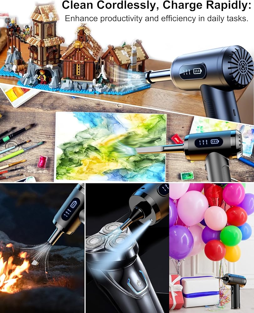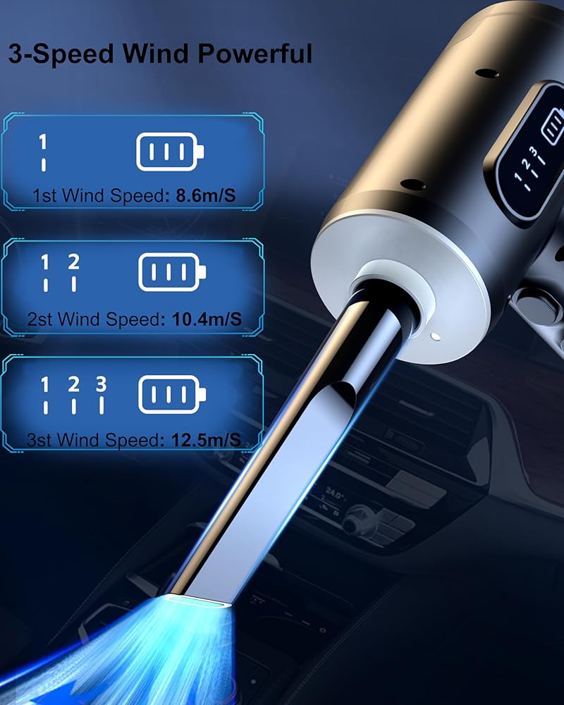 [منفضة الهواء ومنفاخ الهواء 2 في 1] يتميز جهاز الهواء المضغوط هذا بمحرك عالي السرعة و3 سرعات تدفق هواء قابلة للتعديل. اضغط على المفتاح للتبديل بين سرعات الهواء الثلاثة. باعتباره منفضة هواء، فهو مثالي لتنظيف الغبار والقمامة الصغيرة بكفاءة. مثل أجهزة الكمبيوتر وأجهزة الكمبيوتر المحمولة ولوحات المفاتيح وأجهزة PS5 والأرائك ومكيفات الهواء والسيارات وشعر الحيوانات الأليفة وعتبات النوافذ. كمنفاخ هواء، من المفيد جدًا نفخ المراتب الهوائية وحلقات السباحة وكرات اليوجا والمزيد.