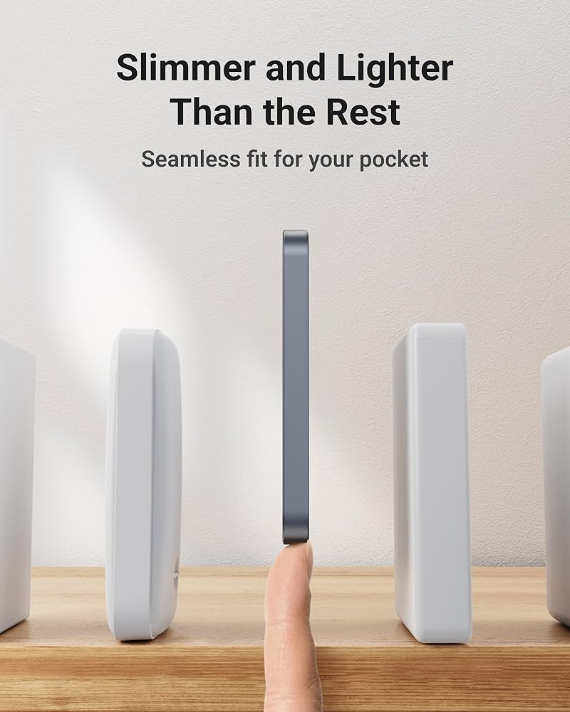 أنحف وأخف وزنًا من أي وقت مضى: الشاحن المغناطيسي المحمول الخاص بنا أنحف بنسبة 37% من الشاحن الآخر حيث يبلغ 0.35 بوصة فقط وأخف وزنًا بنسبة 34%. يتم تثبيت هذا الجهاز القوي بحجم الجيب على هاتفك وينزلق بسهولة في جيبك أو محفظتك للشحن اللاسلكي أثناء التنقل.
