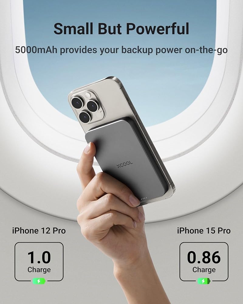 صغير ولكنه قوي: استمتع ببطارية احتياطية موثوقة مع بنك الطاقة المغناطيسي بسعة 5000 مللي أمبير في الساعة، مما يوفر ما يصل إلى 19 ساعة من وقت تشغيل الفيديو لجهاز iPhone 14 Pro Max. استمتع بشحن سلكي سريع بقدرة 20 واط يعمل على تشغيل هاتف iPhone 15 Pro الخاص بك بنسبة 58% في 35 دقيقة فقط. كما أنه يدعم الشحن اللاسلكي حتى 15 وات. استمتع بتجربة الطاقة الفعالة أثناء التنقل.