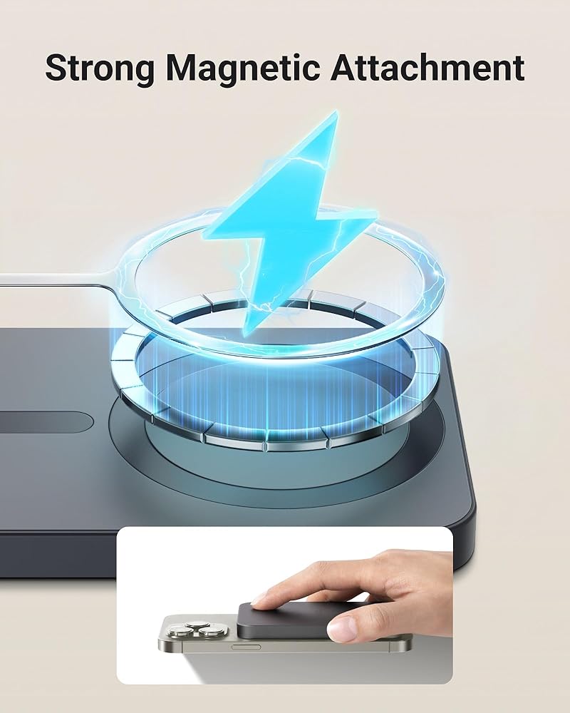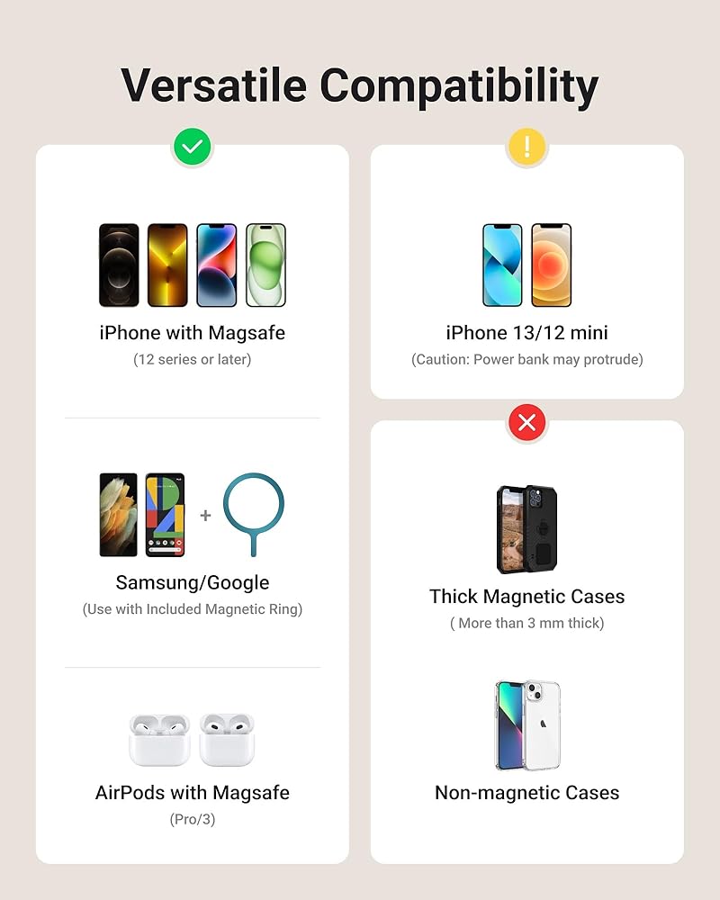 توافق واسع: يدعم موديلات iPhone 15/14/13/12 التي تدعم MagSafe، والهواتف التي تدعم Qi. حلقة مغناطيسية مجانية للأجهزة غير التابعة لشركة Magsafe. يتضمن كابل USB-C إلى USB-C لجميع أجهزة USB-C.