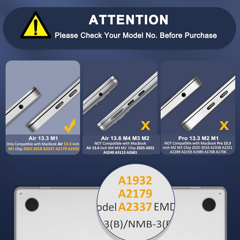 يتضمن غطائي لوحة مفاتيح (أحدهما متوافق مع طراز إصدار MacBook Air 13 بوصة 2022 2021 2020 A2337 M1 A2179 وآخر متوافق مع MacBook Air 13 بوصة 2019 2018 طراز A1932) وواقي شاشة واحد لحماية لوحة المفاتيح والشاشة من الانسكابات. ضمان لمدة عام على الحافظة وغطاء لوحة المفاتيح.