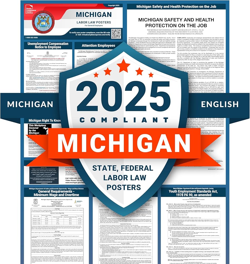 تتوفر لغة مزدوجة: جميع إشعارات ميشيغان والفيدرالية الإلزامية الحالية على ملصق باللغة الإنجليزية، أو ملصق باللغة الإسبانية، أو حزمة حزمة مع كلا الملصقين. من المهم التأكد من أن جميع العاملين لديك يفهمون حقوقهم بموجب قانون العمل.