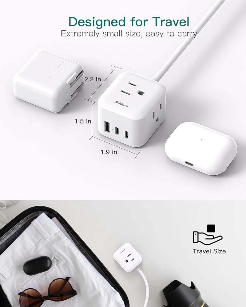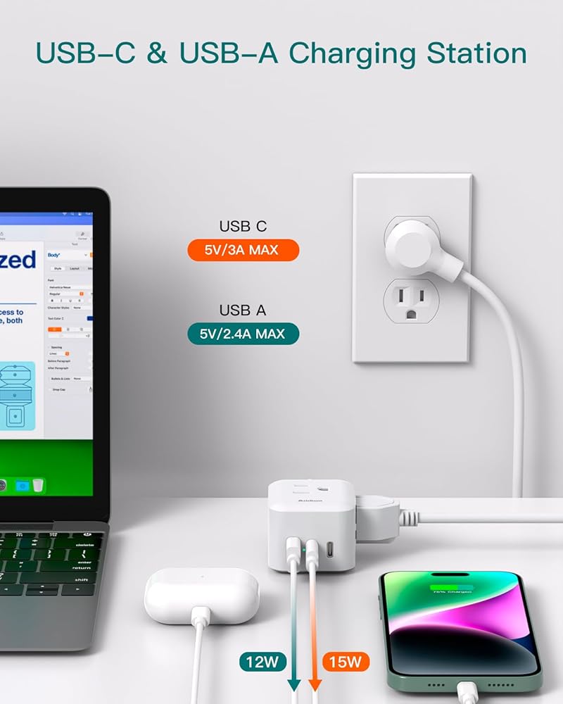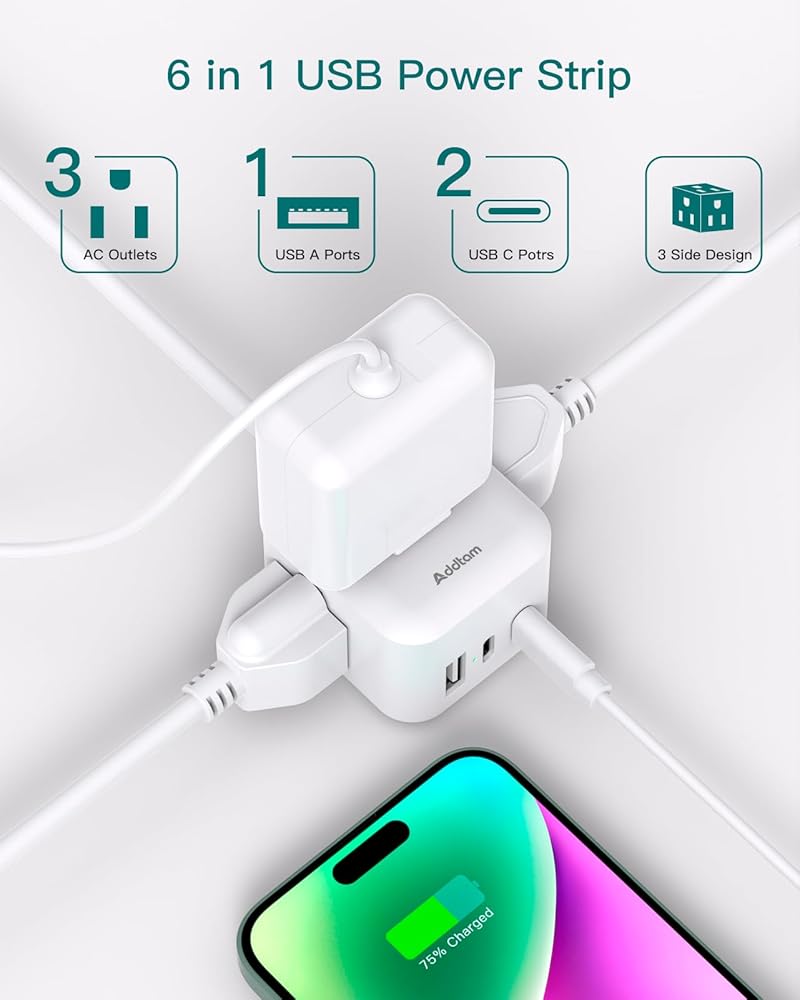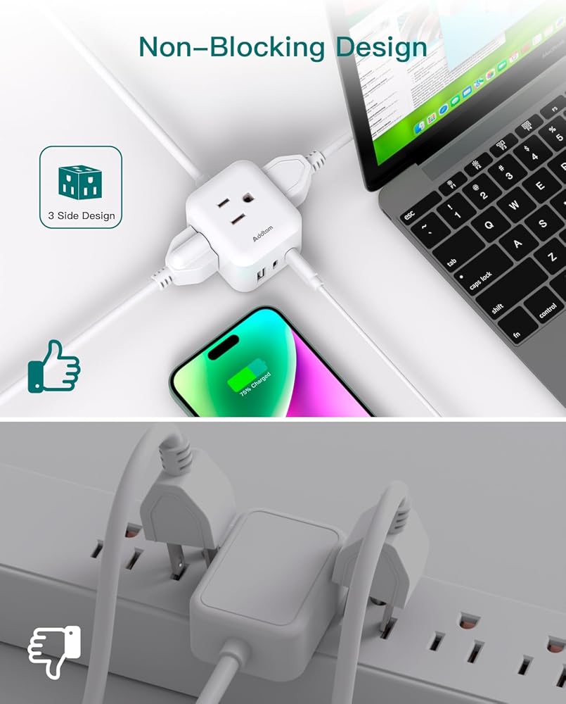 【شريط طاقة 6 في 1 مع منفذ USB】حجم مكعب عملي ثلاثي الجوانب مع 3 منافذ متعددة، ومنفذين USB-C ومنفذ USB-A، مما يجعل سلك التمديد المسطح ذو 3 شقوق يتمدد لشحن 6 أجهزة في وقت واحد. قلل من إهدار سطح مكتبك المنزلي أو مساحة حقيبة السفر