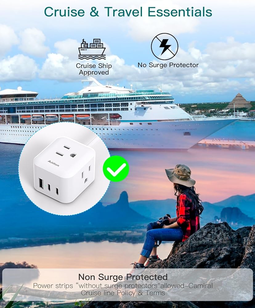 【أساسيات سفينة الرحلات البحرية】يأتي مع عدم وجود حماية من زيادة التيار، شريط الطاقة الصغير هذا هو بالتأكيد ملحق يجب اقتناؤه لسفينة الرحلات البحرية. ملاحظة: ليس للرحلات البحرية الملكية الكاريبية لأنها لا تسمح بأسلاك التمديد من أي نوع