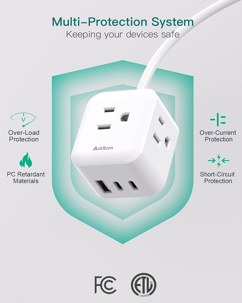 [حماية متعددة للسلامة] تم اعتماد شريط الطاقة الخاص بالسفر هذا من قبل ETL وFCC. مجهزة بنظام أمان من 7 نقاط يتميز بمقاومة الحريق، وحماية من الحمل الزائد للدائرة، وحماية من قصر الدائرة، وأكثر من ذلك، لتمنحك راحة البال أثناء تشغيل الطاقة