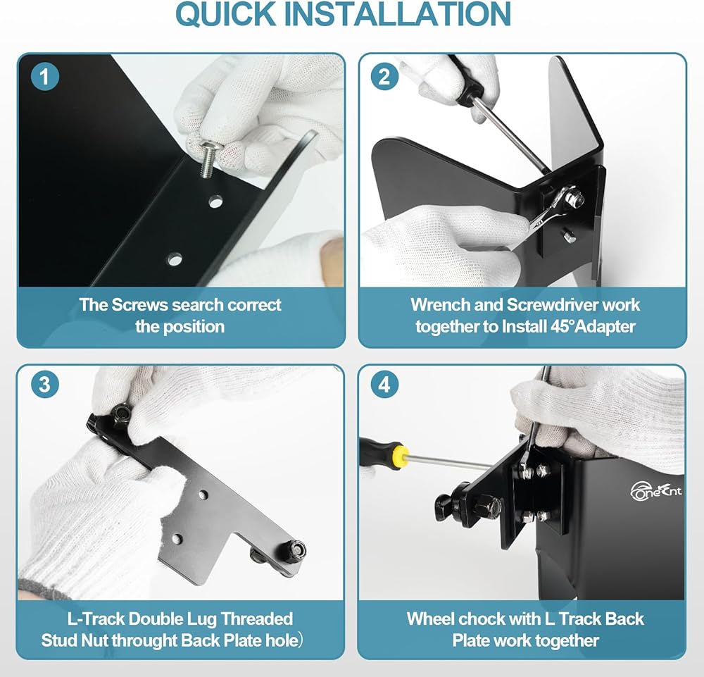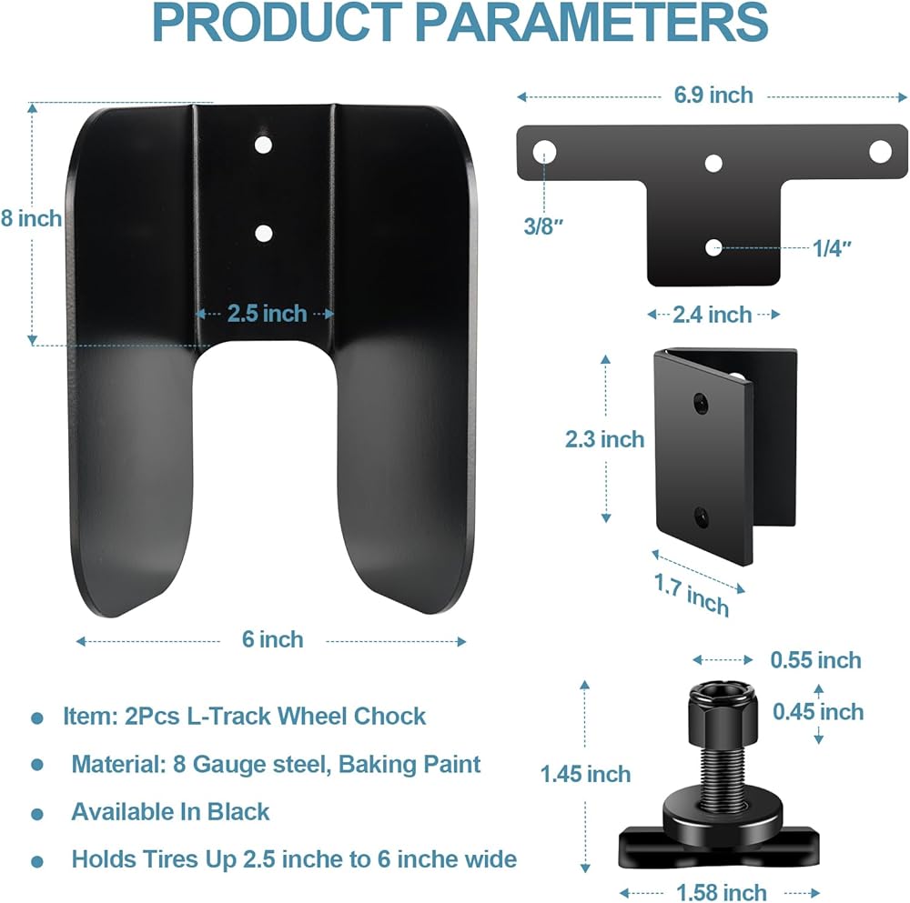 🧰2.【متين وآمن】: التثبيت بزاوية 45 درجة إلى اليسار واليمين، وزوايا 90 درجة. إطارات الدراجات النارية تسير بوتيرة صغيرة واستخدم أشرطة ربط للإمساك بها. يحمل حاجز عجلة الدراجة النارية L-Track إطارات يصل عرضها إلى 2 إلى 6 بوصات.