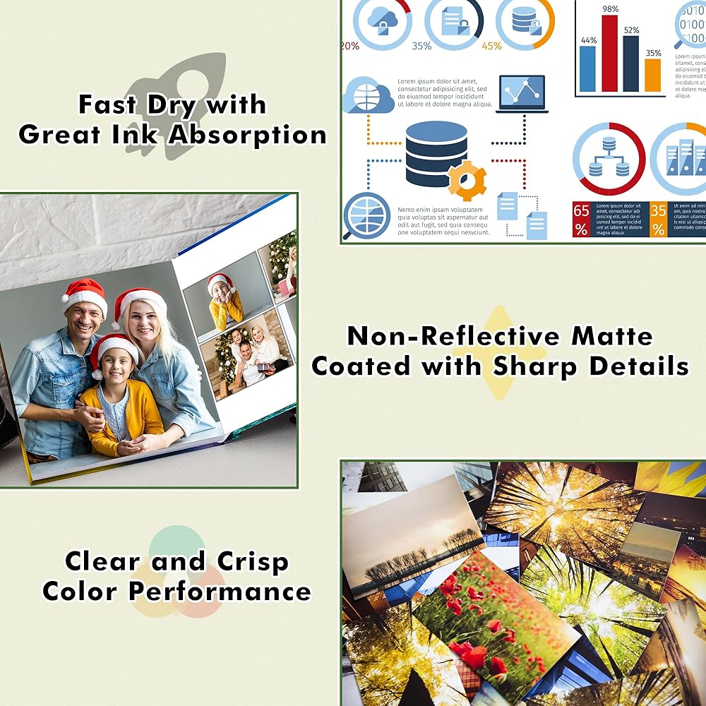 ورق صور غير لامع: تم تصميم الأوراق غير اللامعة عالية الجودة لطباعة الصور والتصميمات والكتيبات والنشرات والمخططات وبطاقات الشكر والقوائم والتقويمات وبطاقات التهنئة وما إلى ذلك