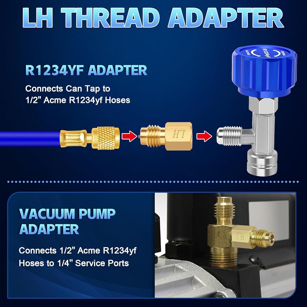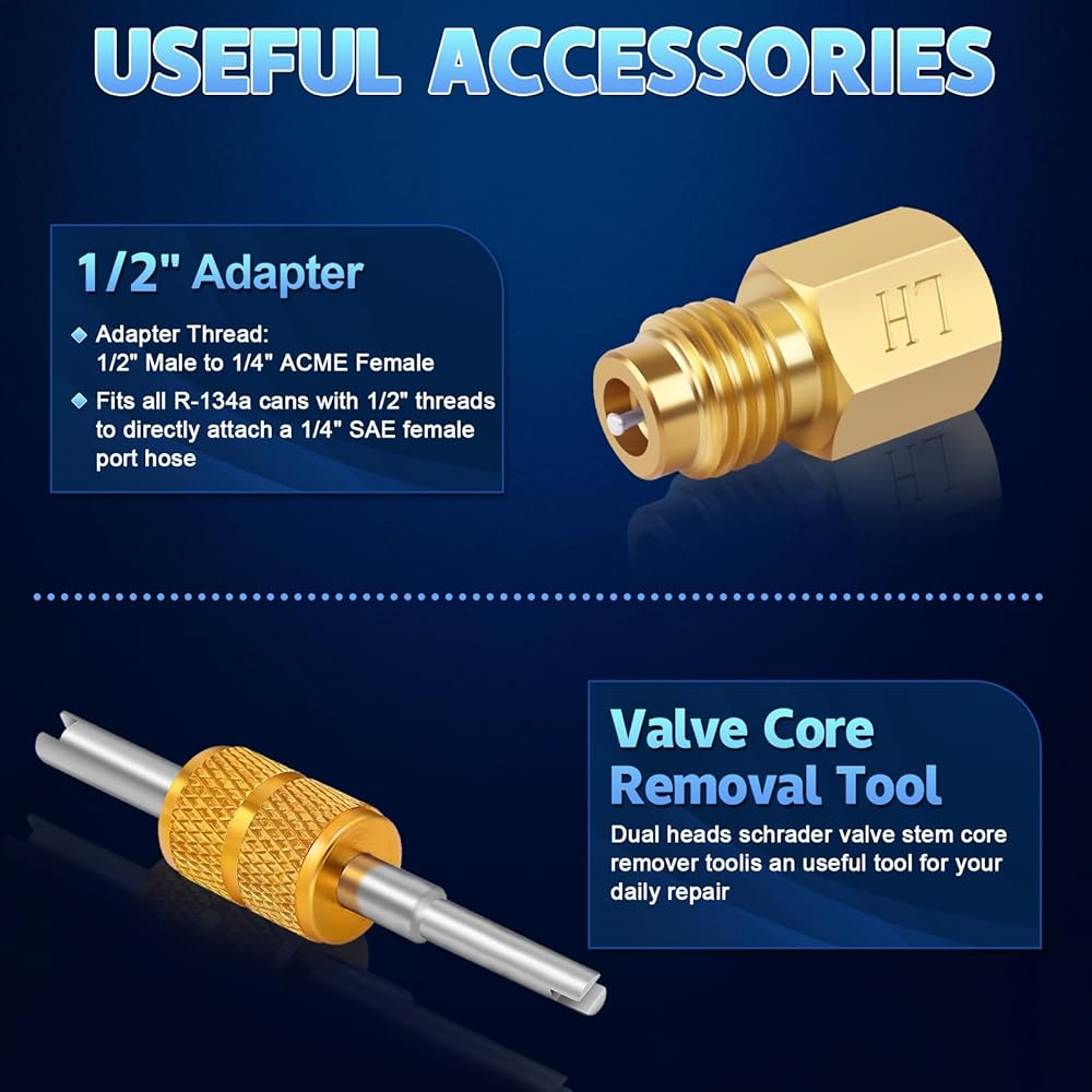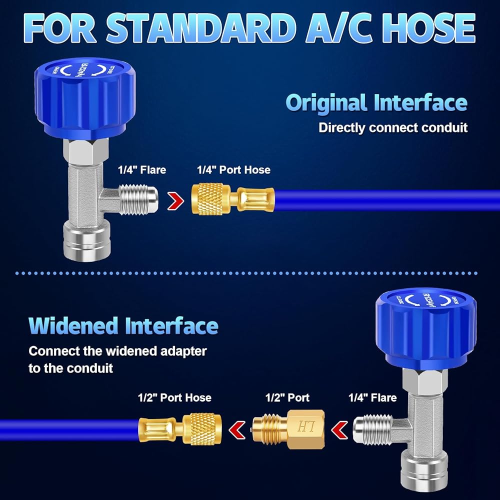 • 【محول خرطوم التبريد 】 يأتي محول خزان تكييف هواء السيارة R134A مع 1/4 بوصة SAE أنثى × 1/2 بوصة ذكر ACME يمكن استخدامه مع معظم خراطيم HVAC القياسية لأنظمة تكييف الهواء التلقائية ومجموعات مضخة التفريغ.