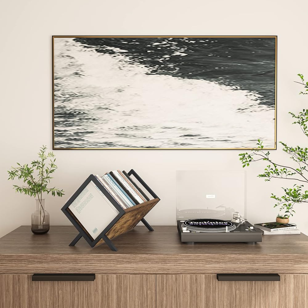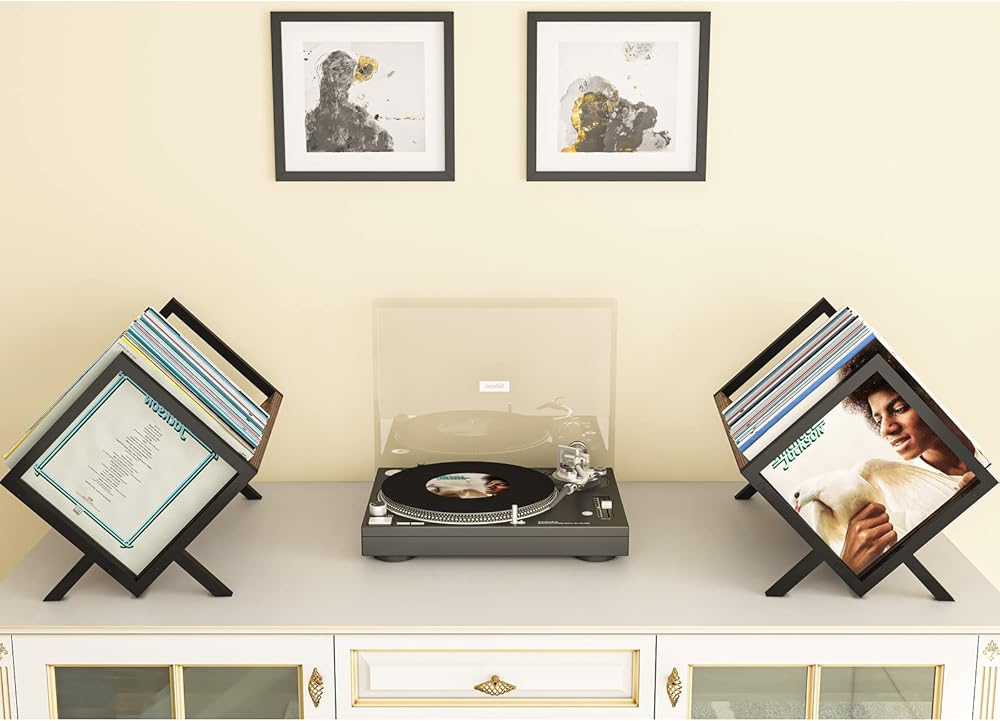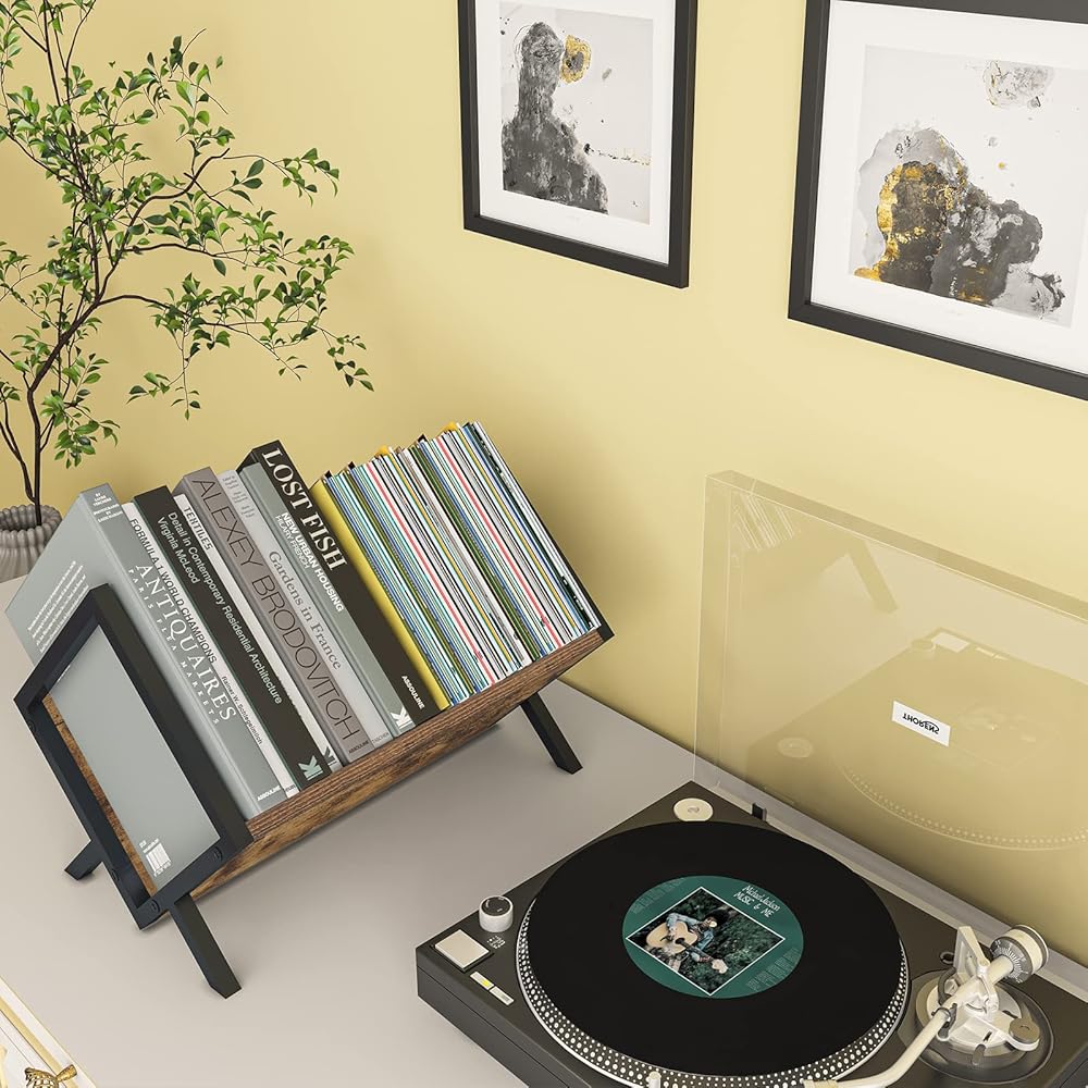 【Strong Metal Construction】This record storage is made of a high-quality, thicker metal tube frame and P2 particle board sheet, ensuring strong stability and maximum load-bearing capacity, Built to last. The minimalist design looks amazing next to a vintage record stand.