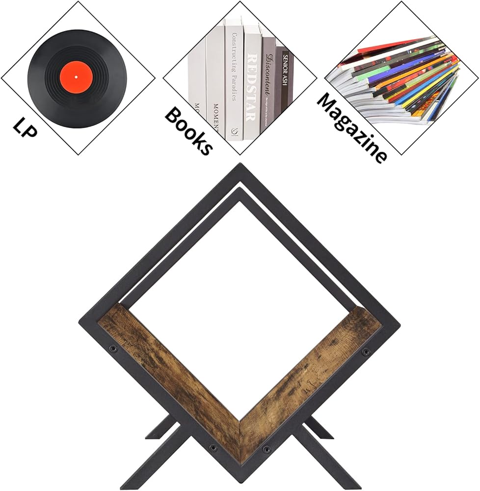 Giikin Vinyl Record Storage Holder Specifications: Color: Rustic Brown Material: Particle Board & Metal Product Size: 15.7”L X 11.6”W X 11.8”H Product Weight: 3.9lb Giikin Vinyl Record Storage Holder - Why Choose Us? 1. High-end vinyl rack can hold 1-100LP's in an organized and stylish manner. Protect your valuable albums using our rack!2.Organize Vinyls! The minimalist design looks amazing next to a vintage record stand. Create a beautiful area designated to music and passion. It is not only suitable for discs, CDs, records,it is also works for books, magazines and files. 3.A heart-warming gift! Having a record stand is perfect for a long time collector. Our products make a great gift for anyone who loves vinyl records. Classic metal and vintage coloured wood panels clash in a design to match any home decor!4. Easy to assemble! Hassle-free assembly with all the necessary tools. Our record holder comes in 4 parts with 8 screws and a spanner... and you've got a beautiful, high-end vinyl record holder in 10 minutes! Record Holder/Vinyl Display/Vinyl Rack/Organize Vinyls//Vinyl Record Storage Rack/Vinyl Record Display/Vinyl Record Organizer/Magazine Holders. Package Contents: Vinyl Record Holder x 1 Accessory Bag x 1 Installation tool x 1 Instructions x 1 Notice: In order to make the shelf more stable, remember to tighten the screws. Wipe the rack shelf with wet duster for cleaning at the first.
