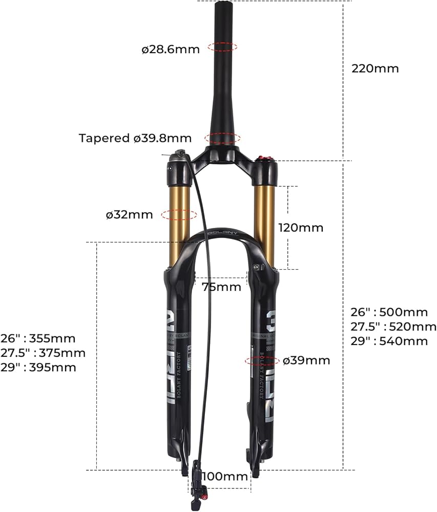 المواصفات: 26 / 27.5 / 29 بوصة اختيارية، بما في ذلك جهاز التوجيه المدبب والتوجيه المستقيم بنمطين، وقفل يدوي للتاج وقفل عن بعد لجهازي قفل. السفر: 100 مم. المحور: 9 مم * 100 مم، نوع الفرامل: فرامل قرصية.