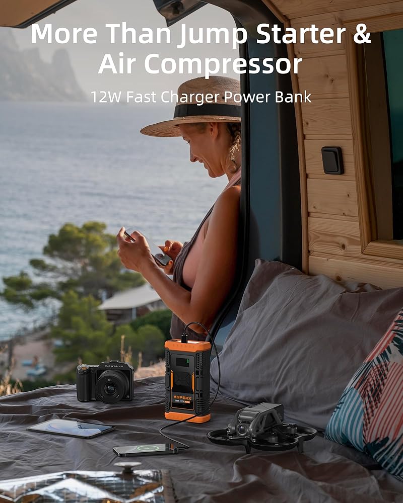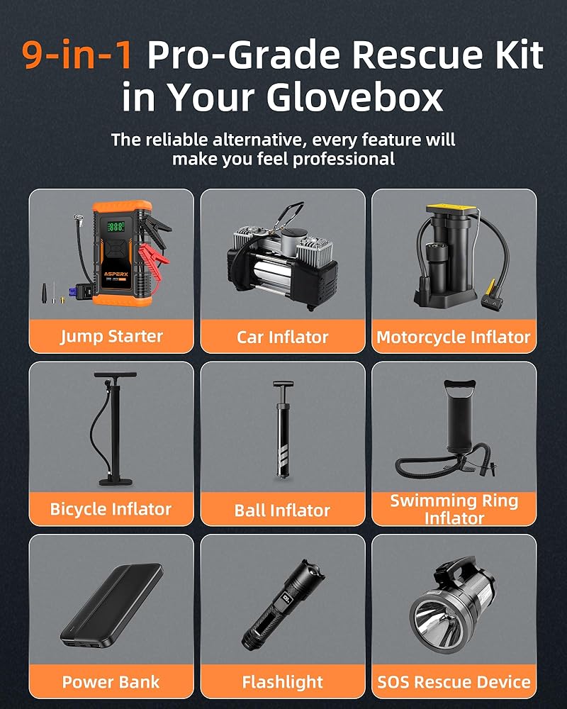 Asperx Jump Starter مع ضاغط الهواء ، 【ترقية وسلامة شهادات】 10L غاز/8L ديزل (تقريبا جميع السيارات) 12V مربع بطارية بطارية بطارية بطارية المحمولة مع نفخ الإطارات ، الكابلات الطائر ، العرض والضوء