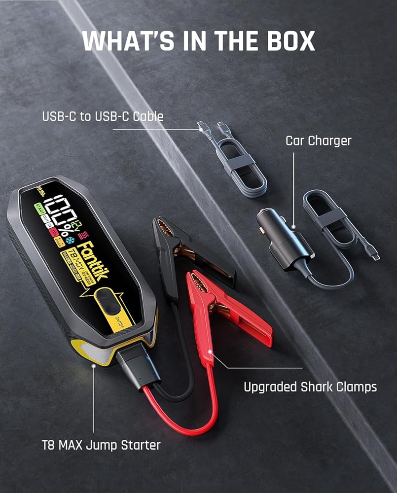 [ما تحصل عليه] حزمة تشغيل بطارية السيارة المحمولة T8 MAX (مقاومة للماء IP65 ومثبطات اللهب، مشابك بطارية شديدة التحمل، كابل شحن USB C إلى C بقدرة 100 واط، شاحن سيارة بقدرة 100 واط، دليل المستخدم، خدمة عملاء موثوقة ودعم فني متخصص مدى الحياة