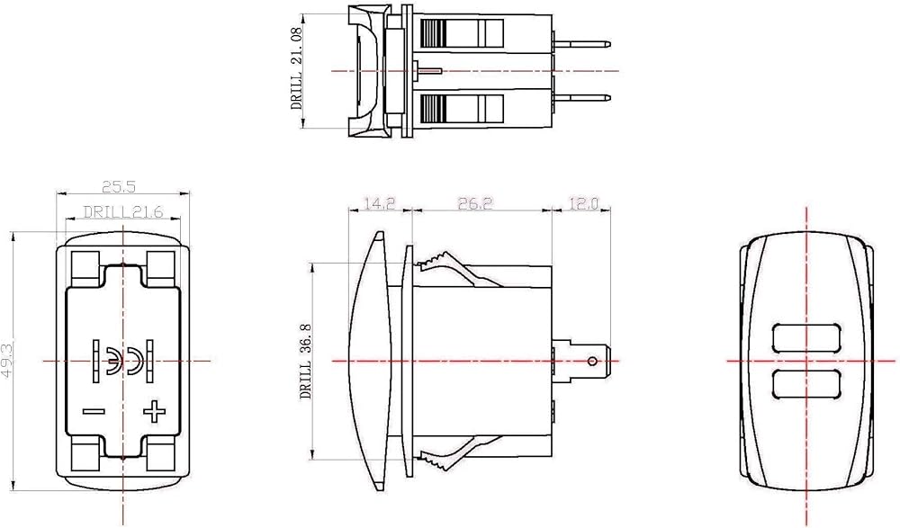 Description 1. Super luxury high end universal refitting switch style usb sockets with LED indicator. 2. CE certification, environmental friendly flame retardant material. 3. 12-24 V voltage general vehicle. 4. Output short circuit protection, overload protection, and polarity protection 5. Product size: 49.57*24.4*49 (mm) 6. Installation of the product rule: 27.2*21.2 mm 7. No rear barriers between terminals