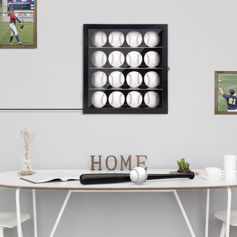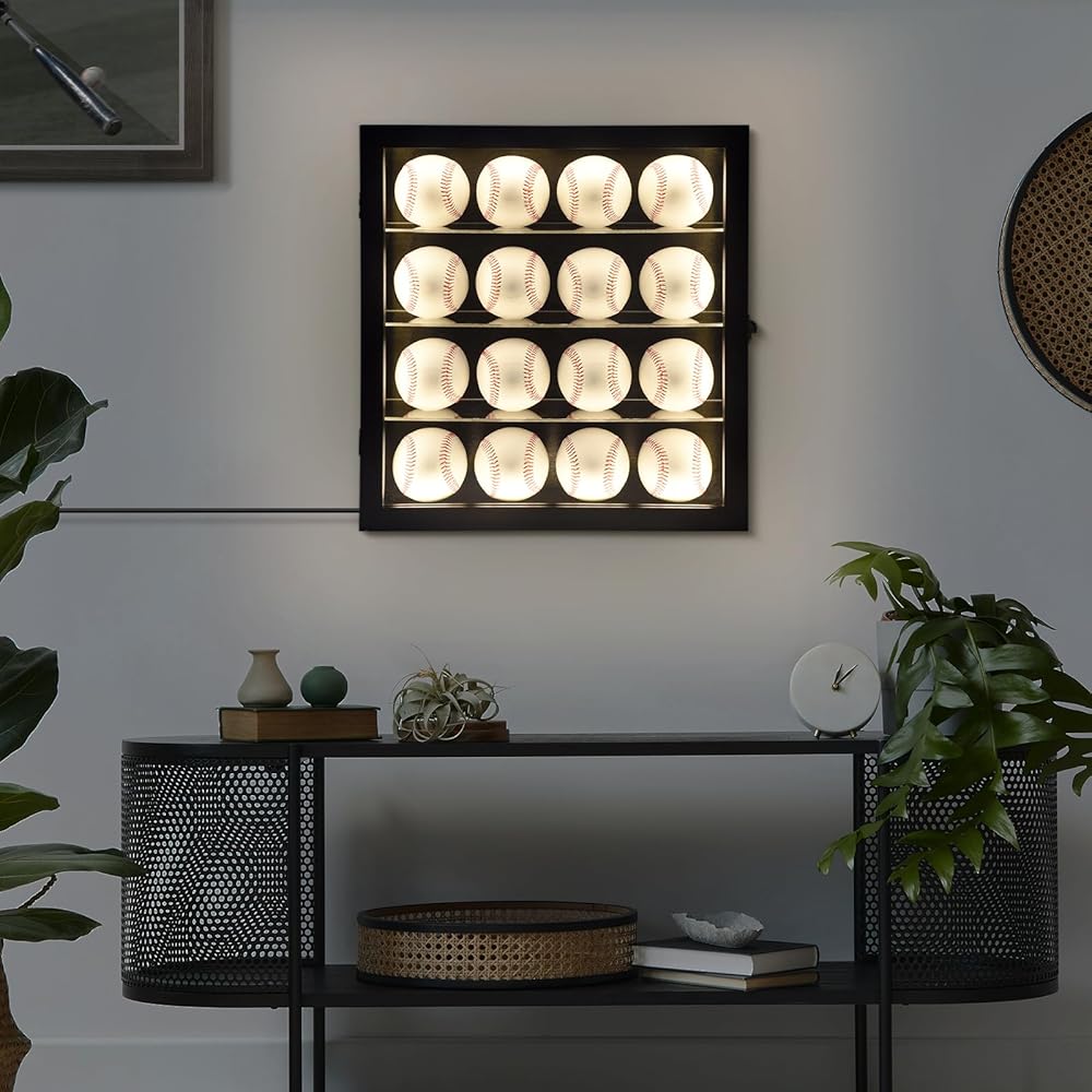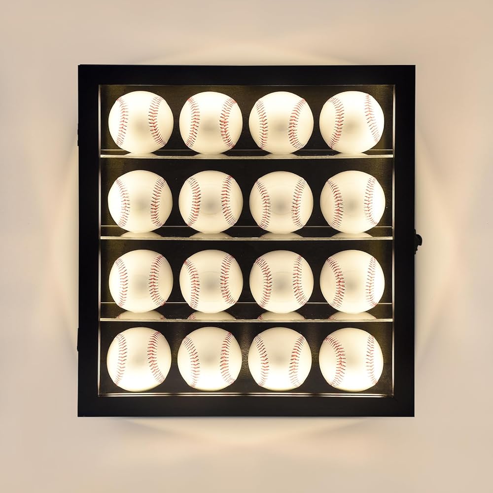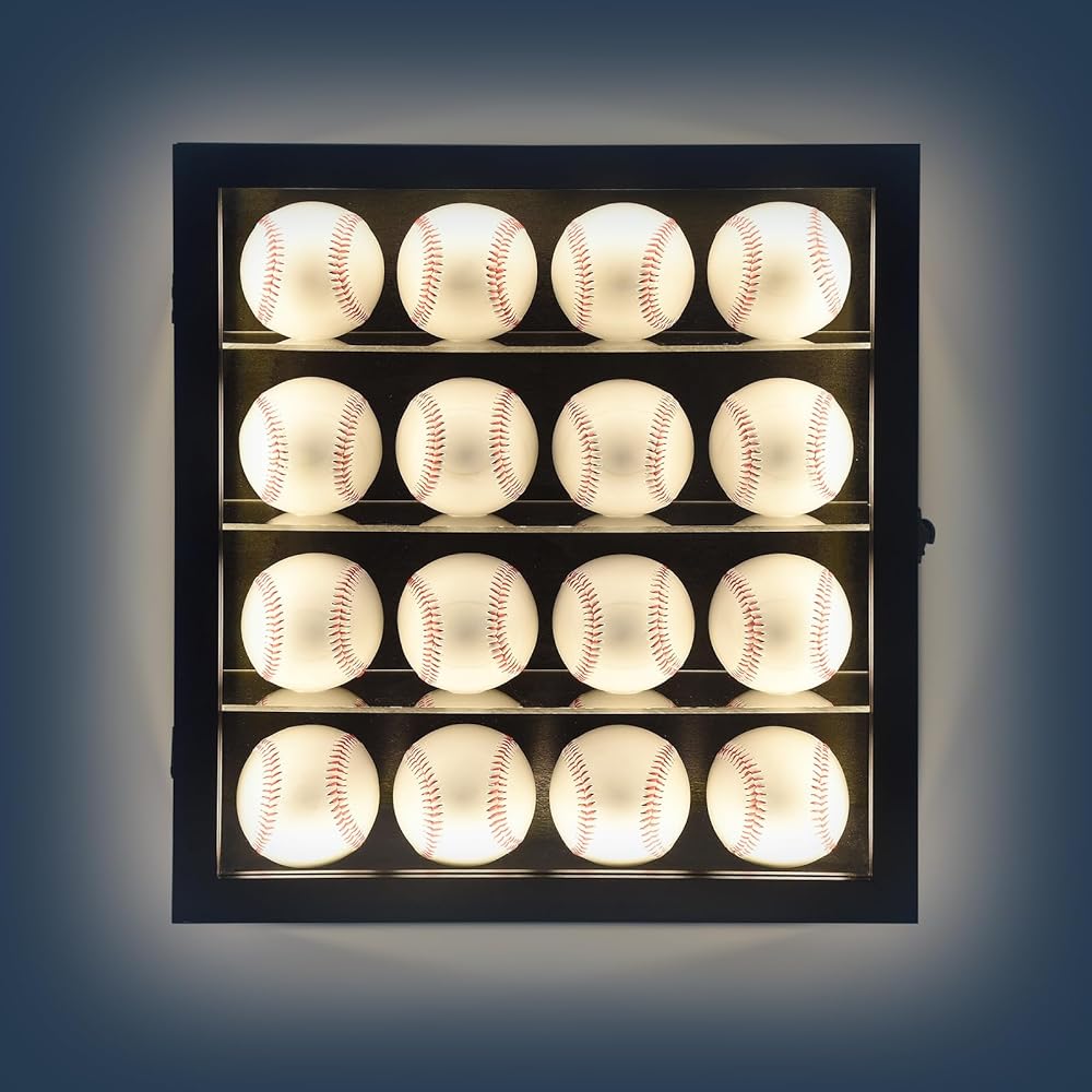 حقيبة عرض البيسبول المضيئة: حقيبة البيسبول مصنوعة من الخشب مع لوحة أكريليك شفافة مضادة للبهتان يمكنها حمل 16 كرة بيسبول. تم تثبيت صندوق ظل عرض البيسبول المصمم حديثًا على الحائط، ويمكن أن يسلط ضوء LED المدمج الضوء على كرات البيسبول العزيزة التي لا تنسى. (ملاحظة: كرات البيسبول غير متضمنة، فقط عبوة واحدة من حافظة عرض البيسبول).