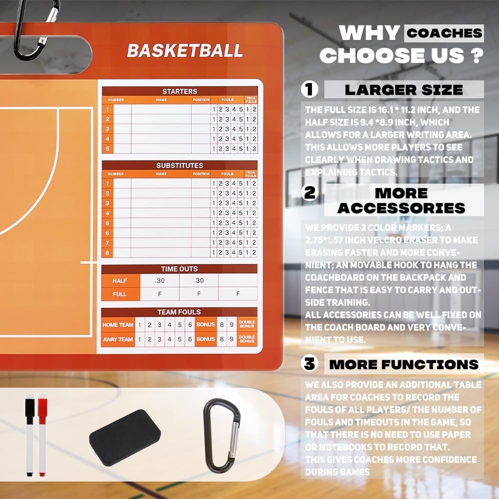 【Larger size】The full size is 16*11.5inch and the half size is 9.5*9inch, which allows for a larger writing area. This can make more players to see clearly when drawing and explaining tactics.