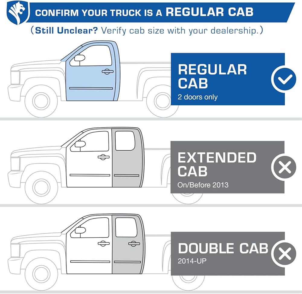 • الملاءمة - متوافقة مع 2007-2018 تشيفي سيلفرادو/جي إم سي سييرا 1500؛ 2007-2019 2500 HD 3500 HD; 2019 سيلفرادو 1500 LD / سييرا 1500 ليمتد | Reg Cab [ملاحظة حجم الكابينة: تناسب فقط الكابينة العادية مع بابين أماميين. (انظر الصورة لمزيد من المعلومات)] | غير متوافق مع نمط الجسم الكلاسيكي | أبعاد المنتج: 52.7 بوصة طول × 3.0 بوصة عرض × 4.6 بوصة ارتفاع