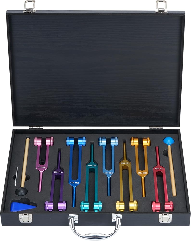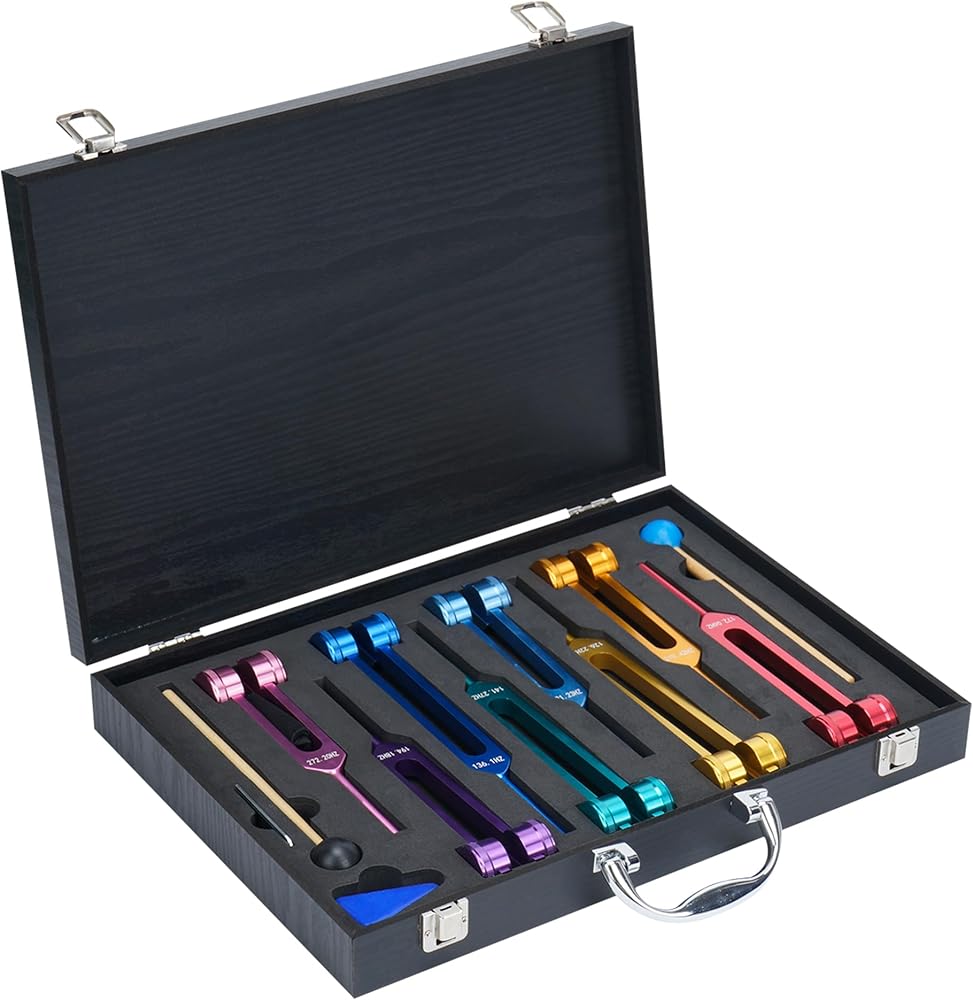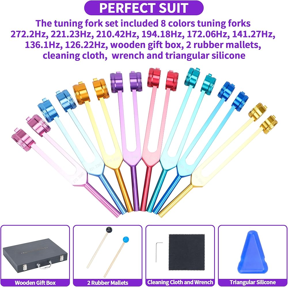 【مجموعة شوكة الضبط】سوف تحصل على 8 شوك ضبط متعددة الألوان، بما في ذلك 126.22 هرتز، 136.1 هرتز، 141.27 هرتز، 172.06 هرتز، 194.18 هرتز، 210.42 هرتز، 221.23 هرتز، 272.2 هرتز، مع صندوق هدايا خشبي، 2 مطارق شوكة ضبط. ، 1 قطعة قماش للتنظيف، 1 مفتاح ربط، 1 سيليكون مثلث. بسبب التلميع والأكسدة والعمليات الأخرى، قد يكون هناك خطأ بسيط بمقدار 0.1-1 هرتز.
